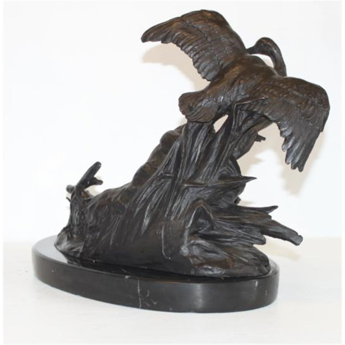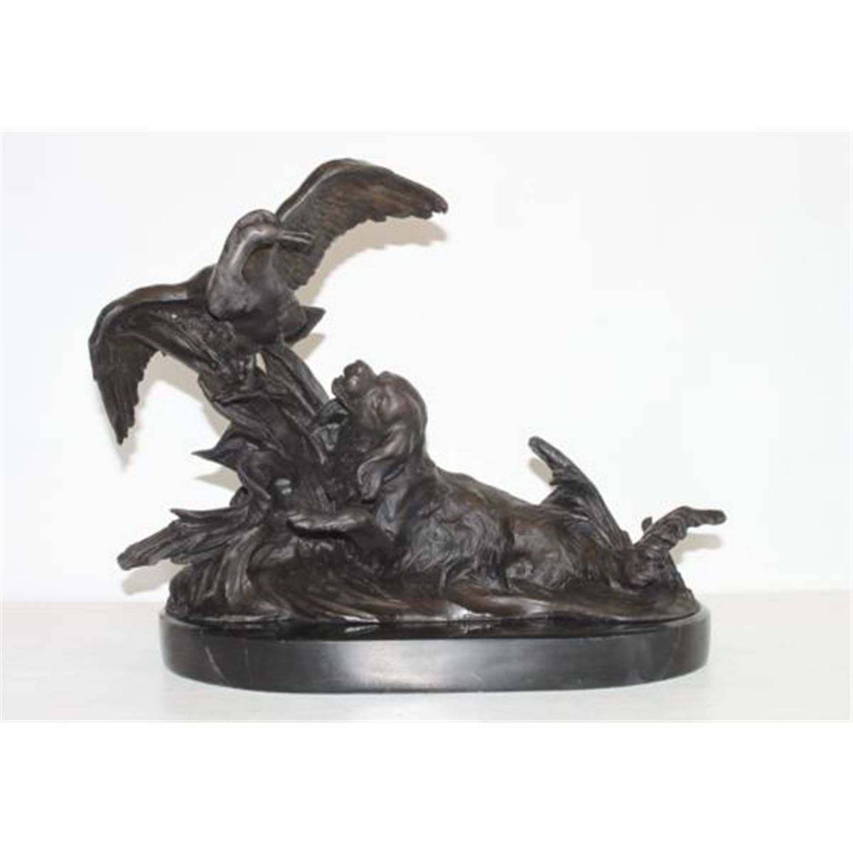 Retriever Hunting Dog and Duck Bronze Sculpture, After Barye 15"L x 8"W x 12"H 18 lbs. This bronze sculpture was produced using the "Lost Wax" casting method. The"Lost Wax" Cast method is the most precise metal casting technique in existence, ensuring exquisite detail of the original host model which is usually sculpted in clay or wax. This "Lost Wax" casting method is an extremely labor intensive and expensive process, but the end results produce a Heirloom Quality Masterpiece!