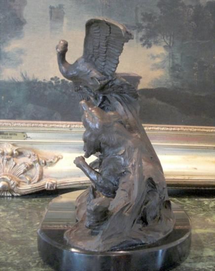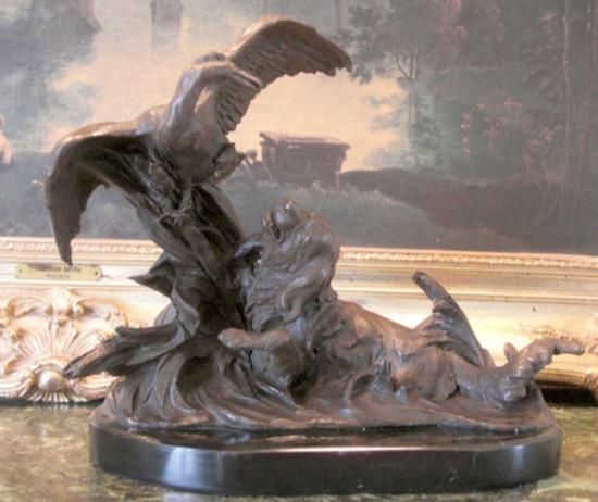 Retriever Hunting Dog and Duck Bronze Sculpture, After Barye 15"L x 8"W x 12"H 18 lbs. This bronze sculpture was produced using the "Lost Wax" casting method. The"Lost Wax" Cast method is the most precise metal casting technique in existence, ensuring exquisite detail of the original host model which is usually sculpted in clay or wax. This "Lost Wax" casting method is an extremely labor intensive and expensive process, but the end results produce a Heirloom Quality Masterpiece!