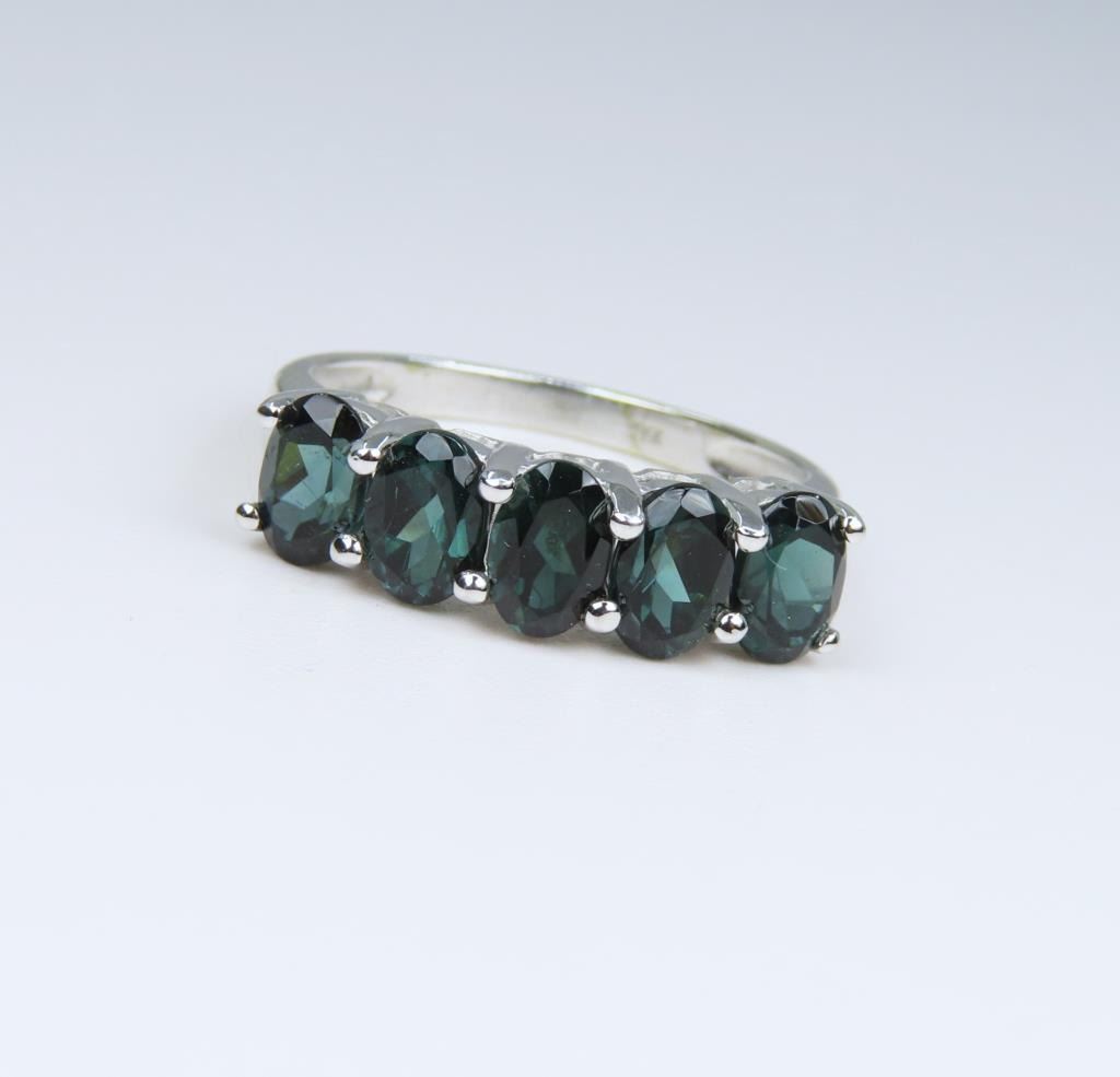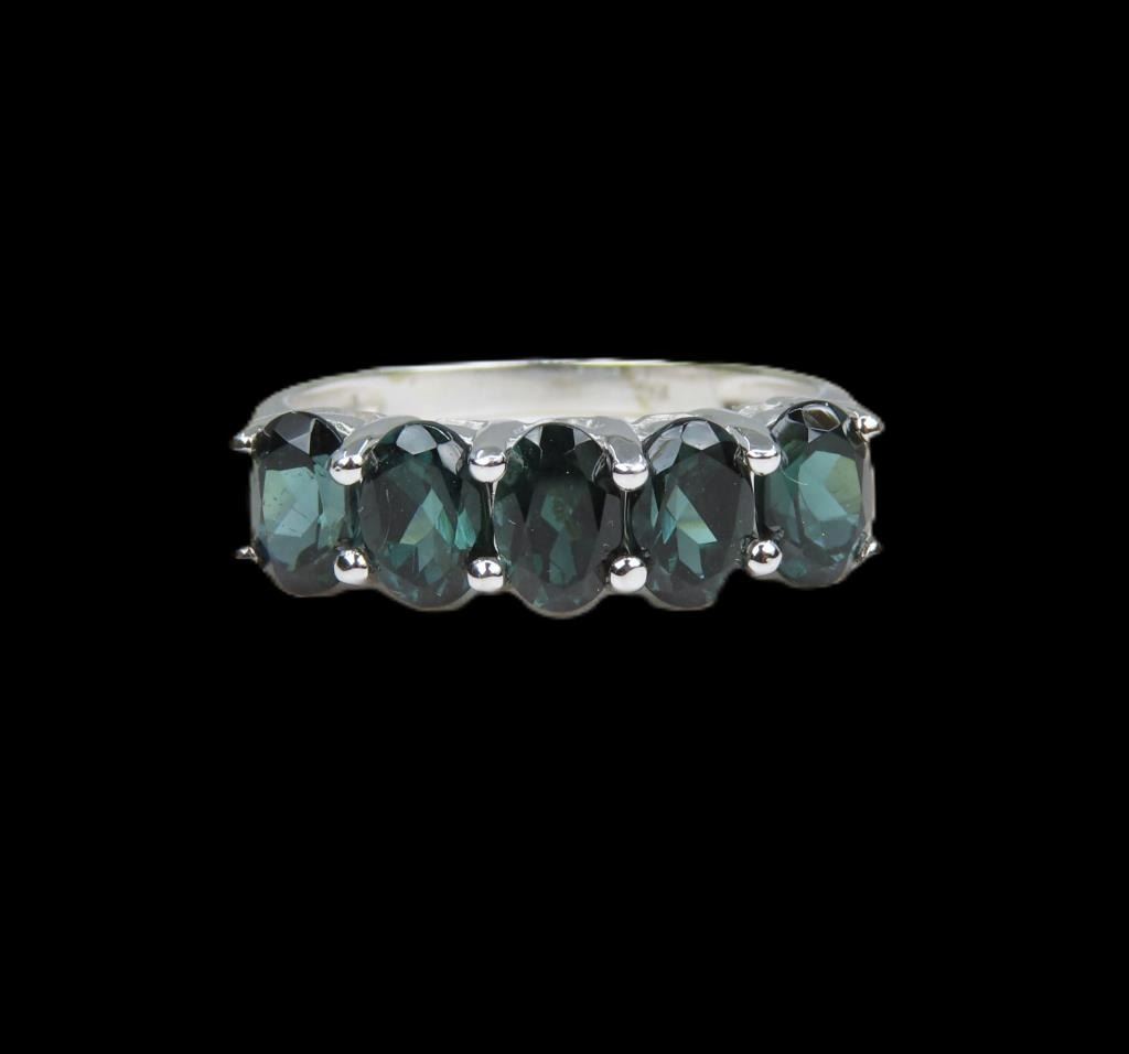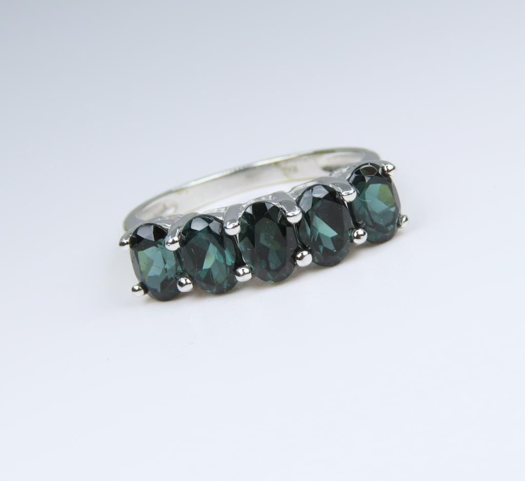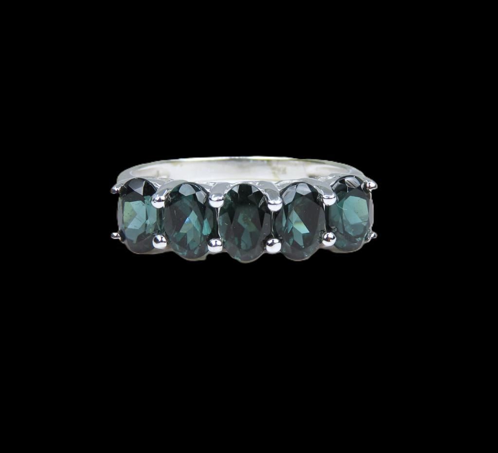 Anniversary design, featuring 5 oval cut deep Green Tourmaline weighing approx. 2.00 carats set in 10 karat white gold setting, ring size 7 1/2.