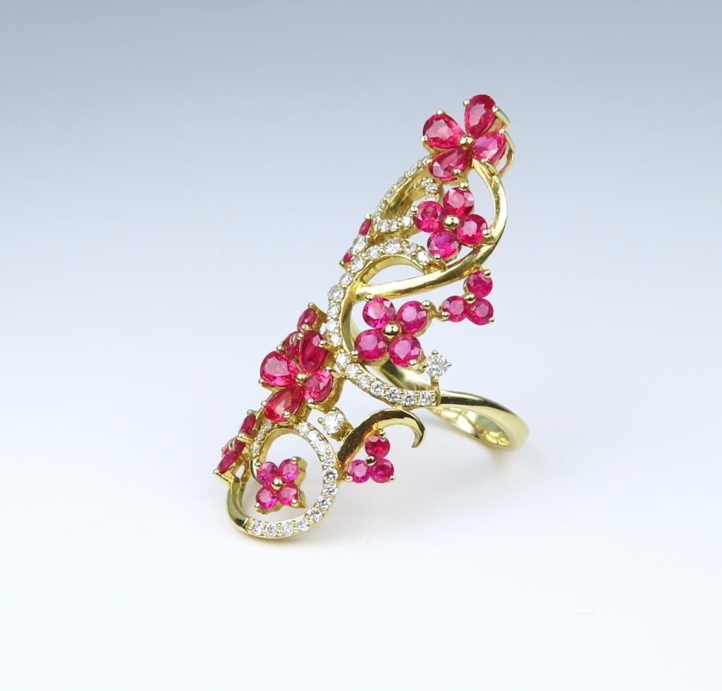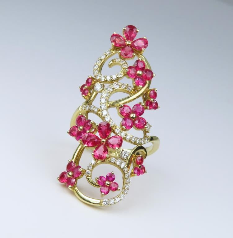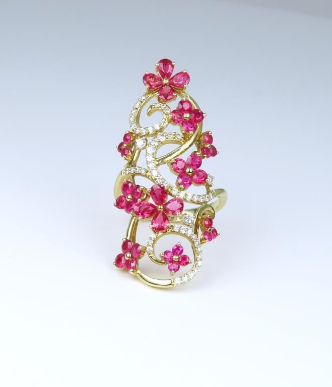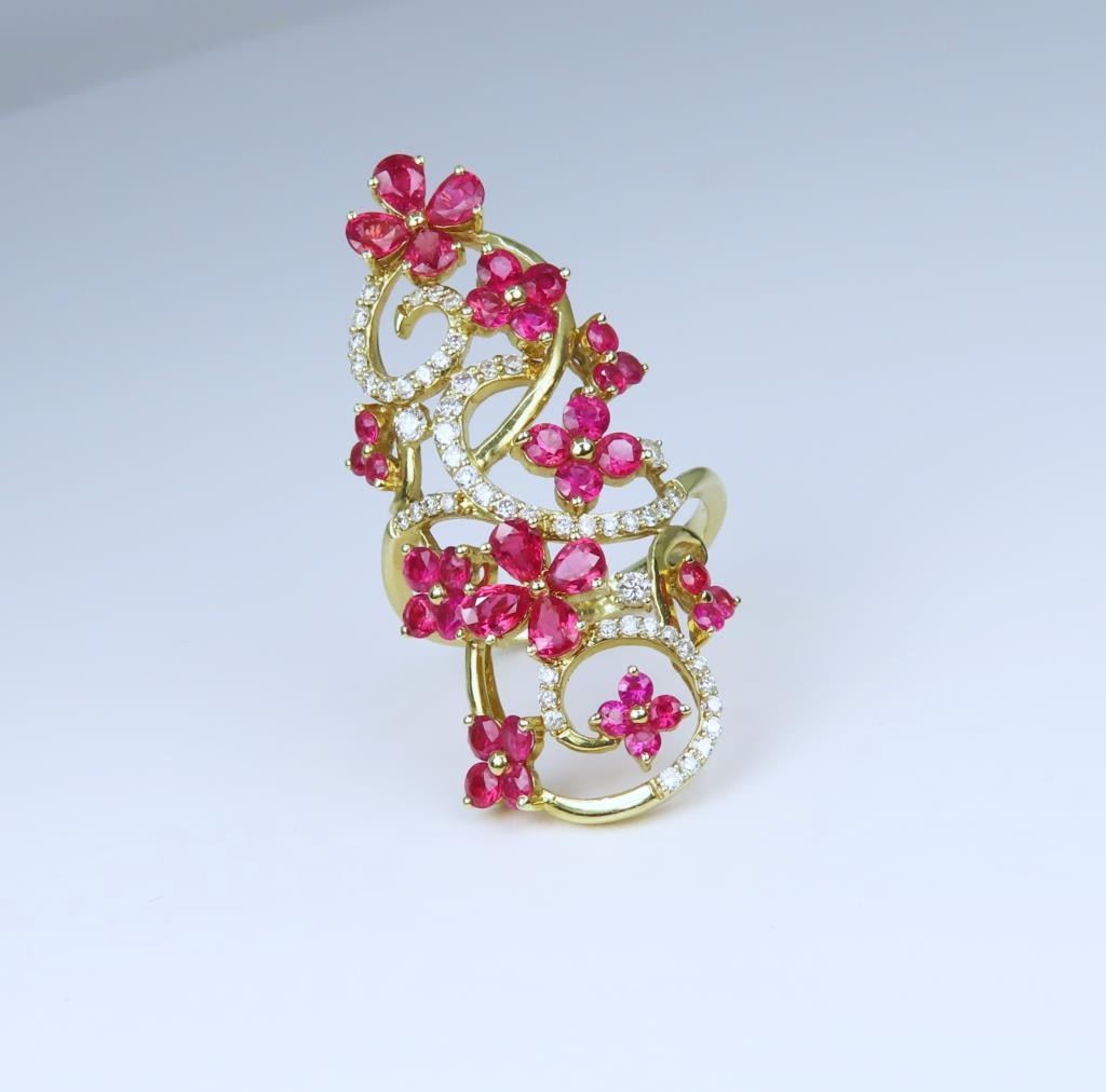 Ring featuring over 90 Fine pear shape Rubies and round Diamonds weighing approx. 2.50-3.00 carats all crafted in a flower design setting in 14 karat yellow gold, size 7 ½. Retail $5,000-$7,000