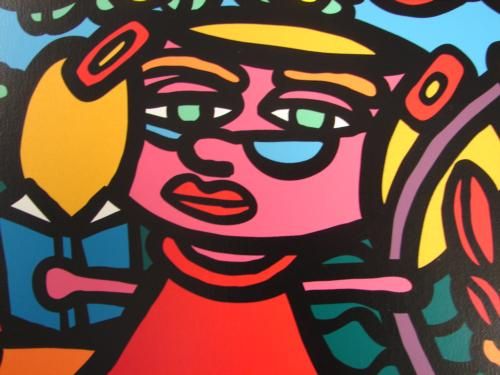 Here's MOM'S GARDEN — a wild and wonderful Pop art print on canvas by wild and wonderful Pop artist MARCO: Serigraph on canvas 18 × 27 Signed and numbered from a total limited edition of 375 Excellent condition; unstretched Certificate of Authenticity Here's the buzz from the bio page on the well-known artist's web site: "Marco's work has graced the front page of the NY Times Sunday Magazine, Crain's New York, ADWEEK, and was recently featured on the hit FOX TV Show American Idol, New York One, NBC's TODAY Show, and ESPN's Cold Pizza. Marco was appointed as an Official Artist for The 2004 US Olympic Team by The United States Olympic Committee, and created POP Portraits of all of the 2003 NBA All Star Players including Michael Jordan, and Shaquille O'Neil. Gibson Musical Instruments released a hand painted "Marcoart Guitar" and watch giant Swatch commissioned Marco to paint over fifty of it's stores worldwide, in addition to having him create the best selling Artist Swatch of all time: "The Alien Baby." Express commissioned Marco to design "Cyclone Angel" hang tags for their jeans, Onward enlisted Marco to design an entire product line for their "Field Dream" stores in Japan, and Deutsche Telecom printed up 250,000 phone cards with Marco's images on them. Marco has raised thousands of dollars by donating his masterful dynamic paintings to benefits for: The Rainforest Alliance; The Gay and Lesbian Anti-Defamation League; Body Positive; Muscular Dystrophy; United Cerebral Palsy; St. Vincent's Hospital and Mount Sinai Hospital to name just a few. Current projects include animation, children's books, an extensive clothing and product line, and worldwide fine art distribution. Not bad from someone who started as "The Prince of Greene Street" selling his canvases on the corner of Prince and Greene streets in SOHO in the late 80s." Wow!