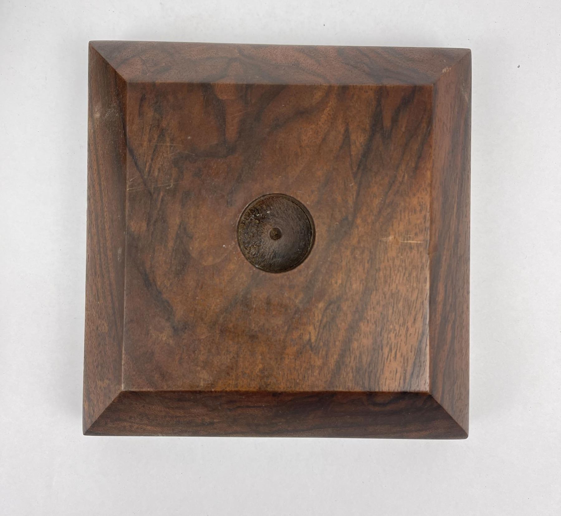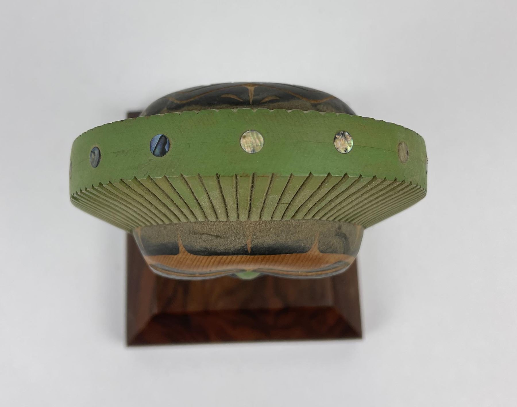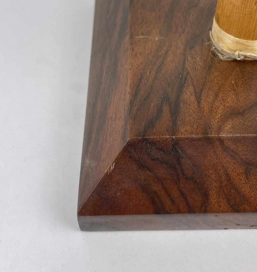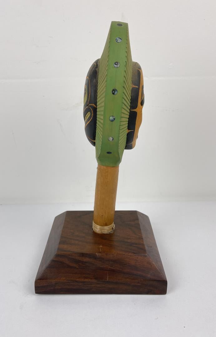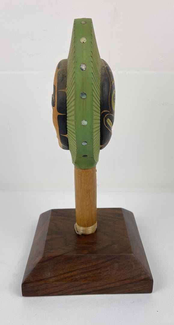 Very nice contemporary piece. Double sided with abalone inlay. Signed on the bottom as shown. Beautiful heavy grained stand included.