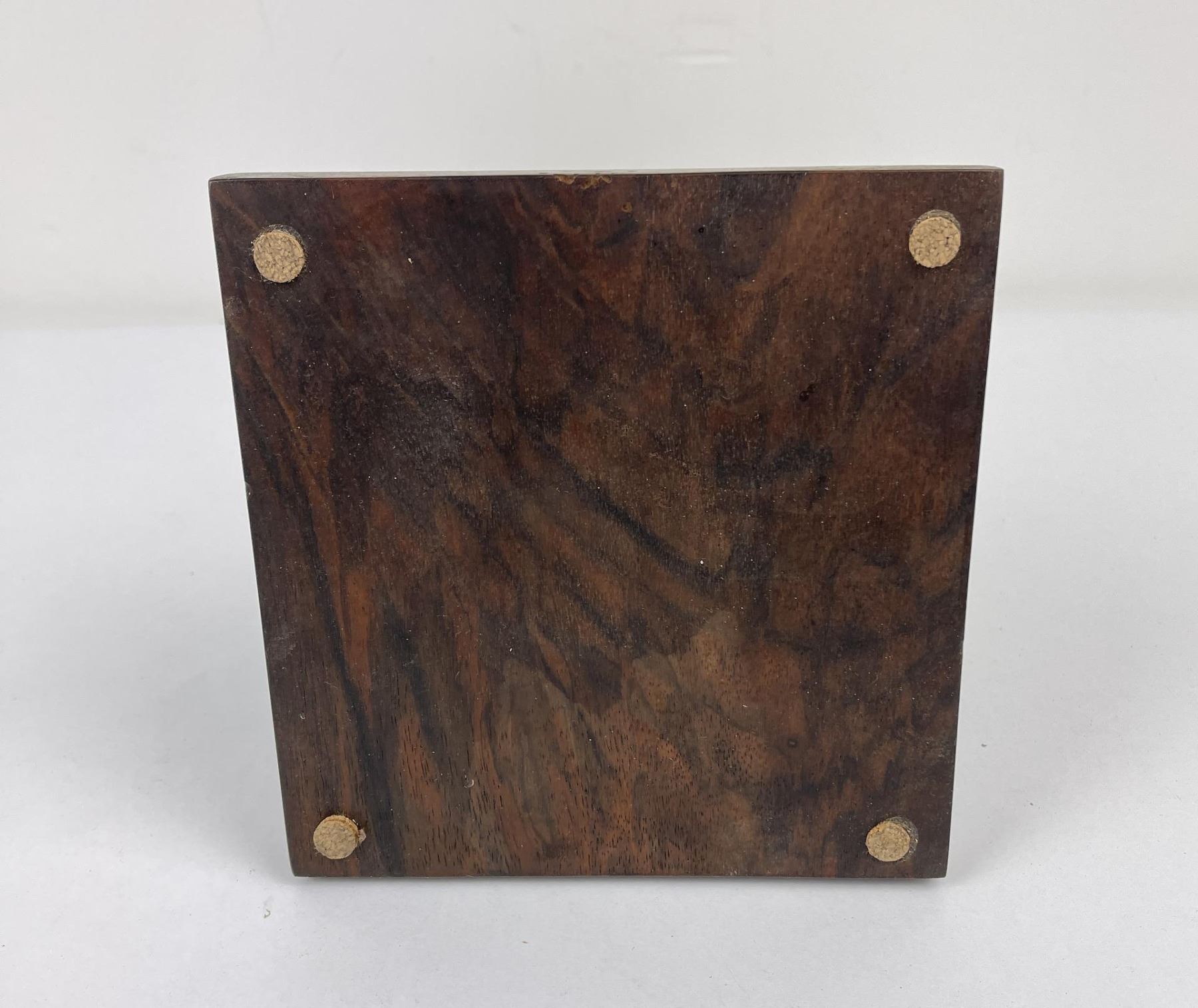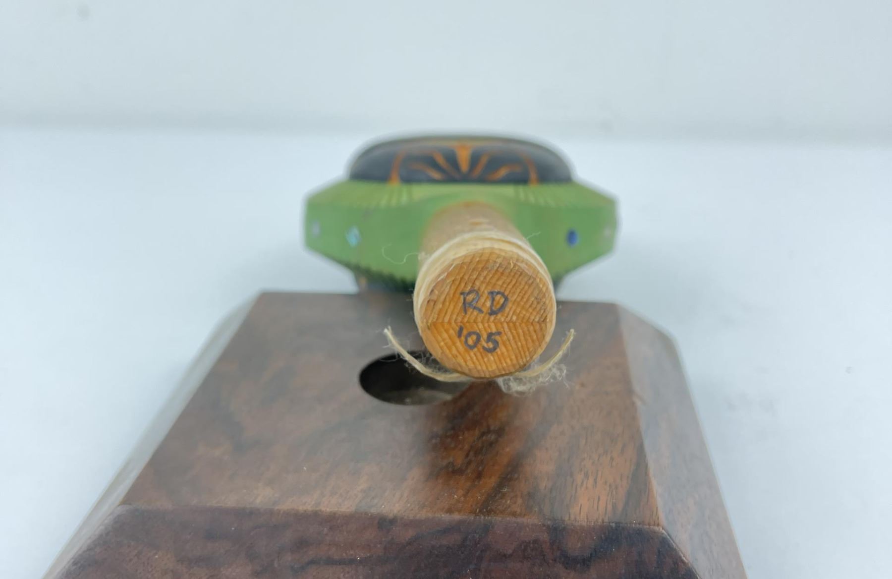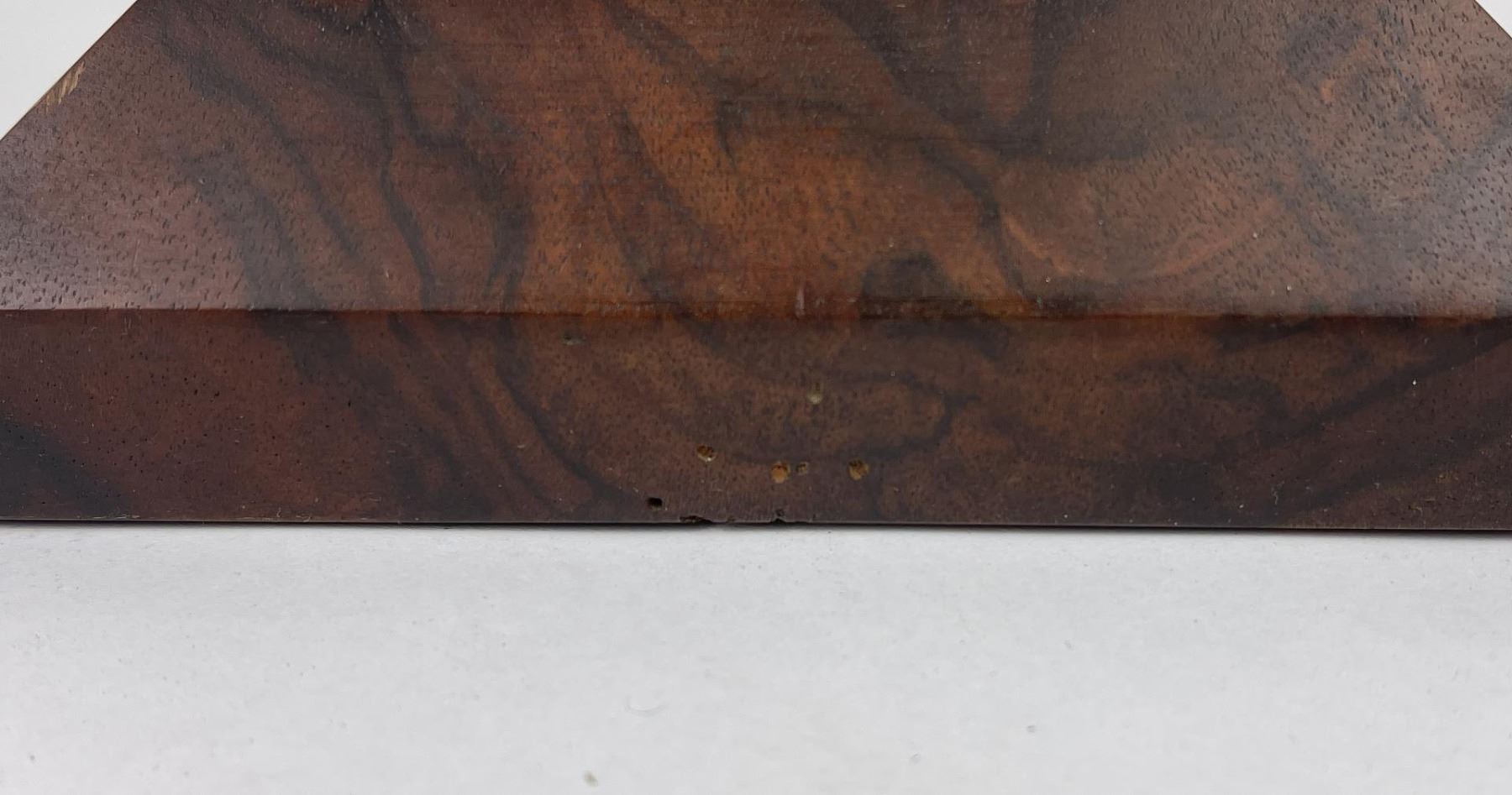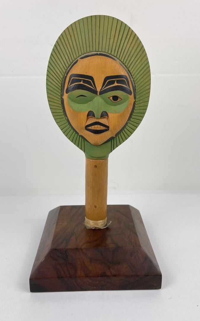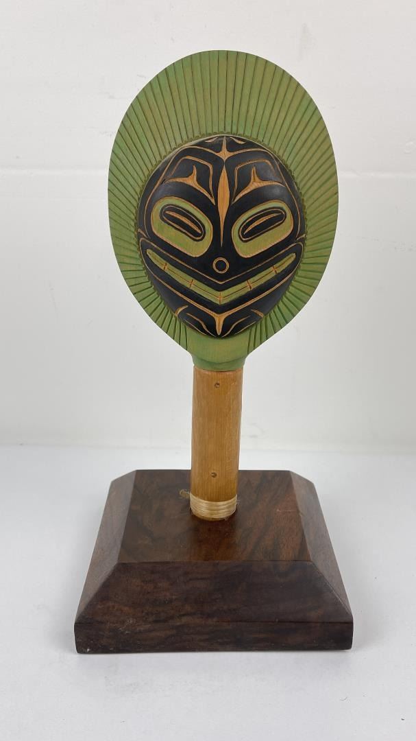 Very nice contemporary piece. Double sided with abalone inlay. Signed on the bottom as shown. Beautiful heavy grained stand included.
