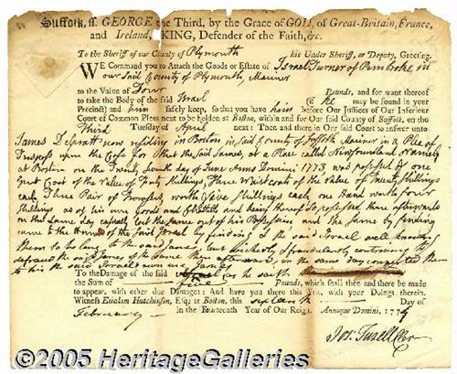 <B>Wonderful President John Adams Handwritten Document Regarding the Warrant for Daniel Marrow</B></I> Second U.S.President (1797-1801). A lawyer and early supporter of the independence movement, John Adams (1735-1826) defended the British soldiers accused of the Boston Massacre. In the Continental Congress, he helped Jefferson and Franklin draft the Declaration of Independence, which he signed. As Washington's Vice President, he founded the Federalist Party. Elected President in 1796, his term was marked by problems, such as the XYZ Affair with France, and passage of the Alien and Sedition Acts. In his retirement, he carried on an extensive correspondence, and saw his son, John Quincy Adams, elected as the sixth President. He died at the age of ninety on July 4, 1826. One page, 12.5" x 7", February 3, 1774, Boston. Wonderful document with well over 200 words in Adams' hand. In part the document reads, "We command you to attach the goods or estate of Daniel Marrow of Midway in said County of Suffolk Yeoman to the value of twenty pounds, and for want thereof to take the body of Daniel (if he may be found in your precinct)...." The rest of this lengthy document is in Adams' hand. <I>Accompanied by COA from PSA/DNA.</B></I>