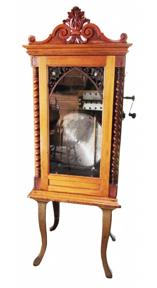 Regina Changer Music Box. Flat front with walnut cabinet. Comes with 15 1/2 inch discs. All original good working condition. 26 X 70 X 21 1/2 inches.