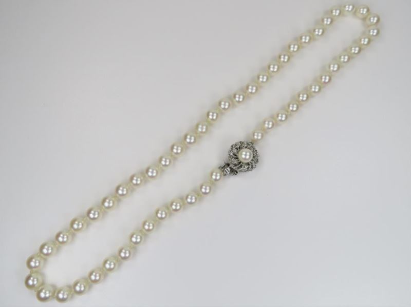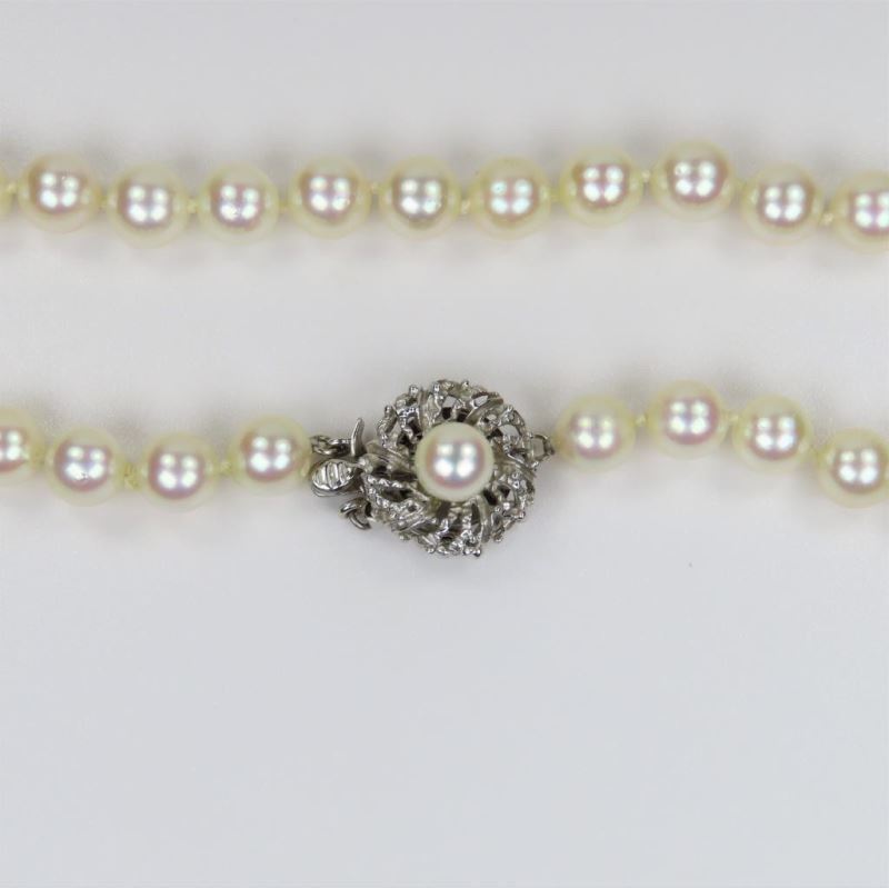 With Rich Luster Uniform Shaped Measuring 16 Inches In Length With Highly Detailed Decorative Clasp In 14 Karat White Gold.