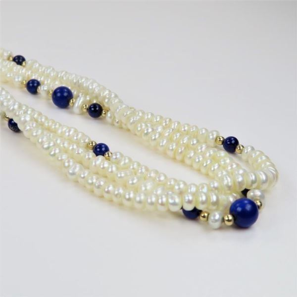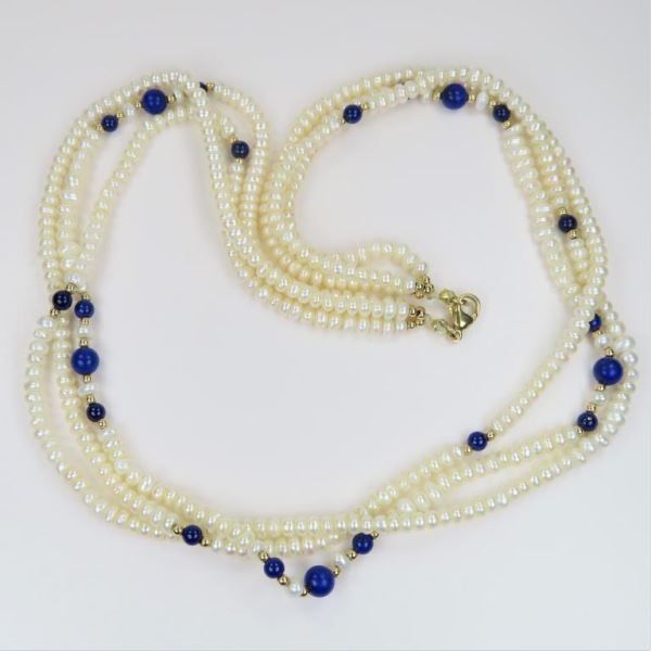 Beaded Necklace featuring Ivory Button freshwater Pearls accented with rich blue Lapis Lazuli beads and 00 karat yellow gold beads and clasp, measures 19 inches in length.