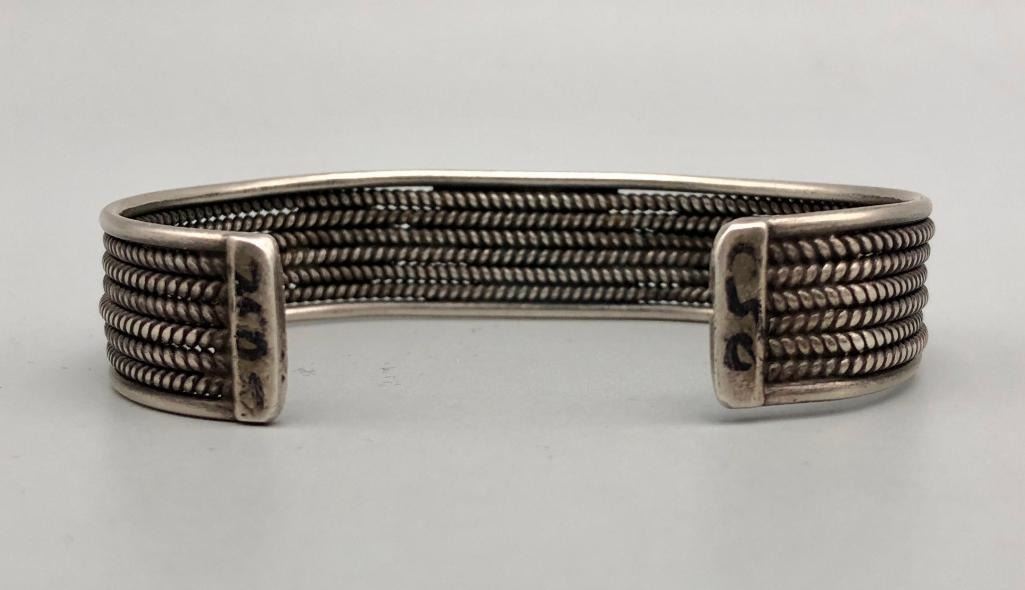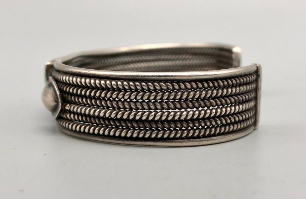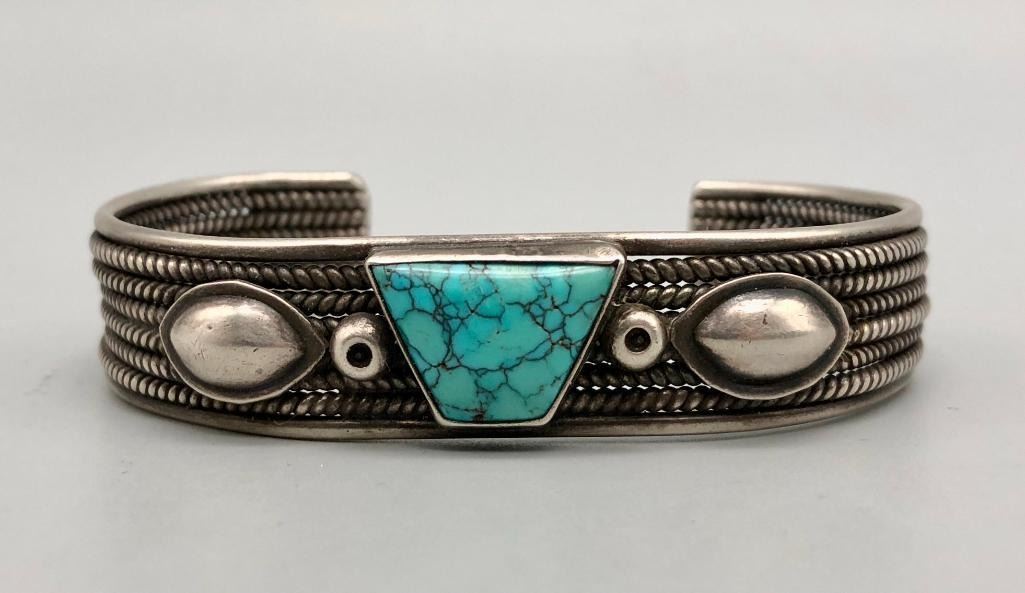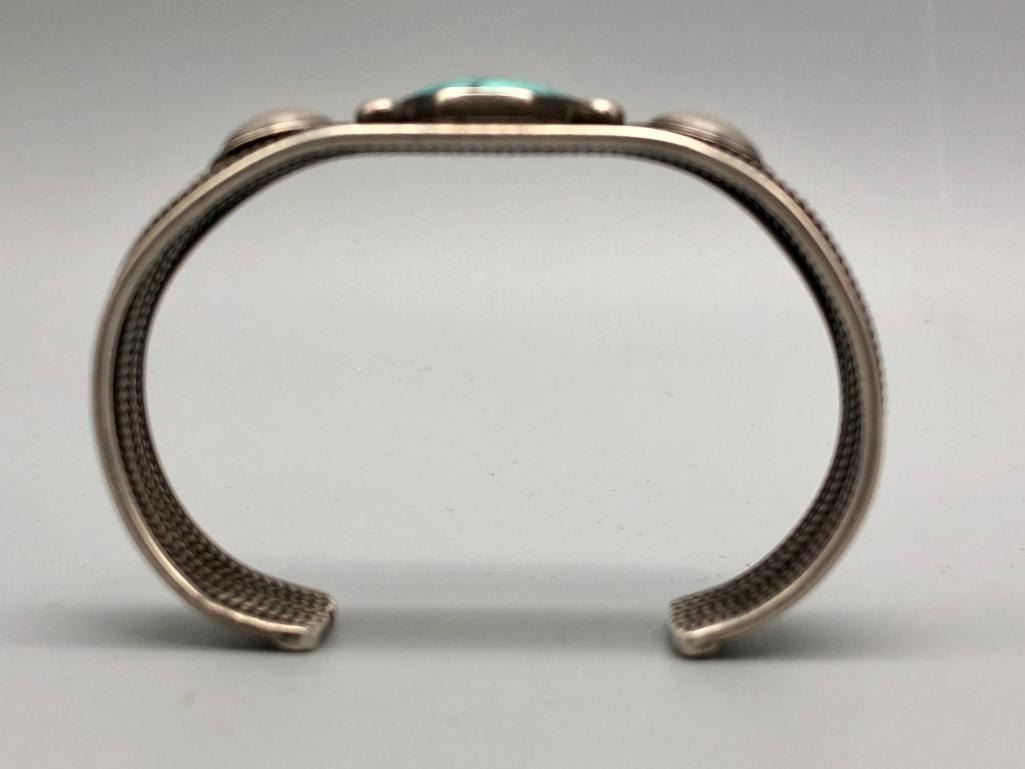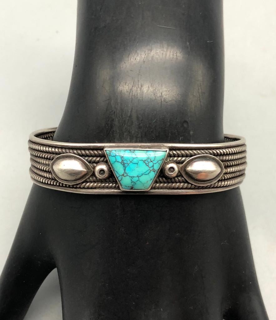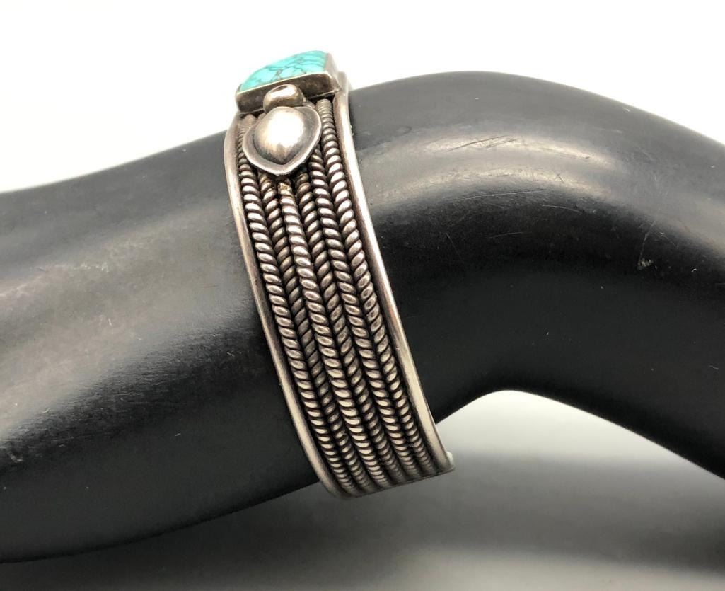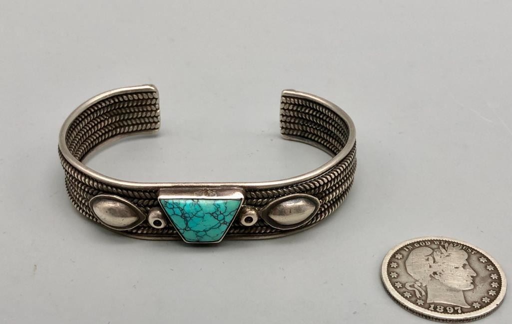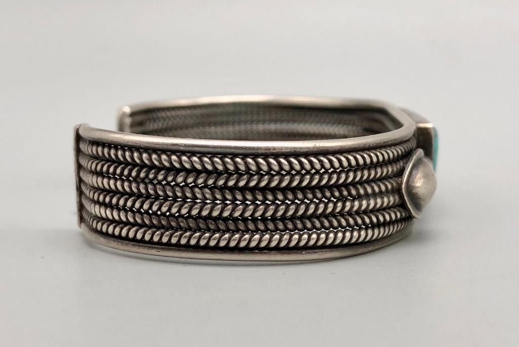 Offered for sale in this lot is a wonderful vintage bracelet with spiderweb turquoise. This is a great bracelet that is set with a beautiful turquoise cabochon with decorative silver dots and "bump out/repousse" work. The cuff is made up of many fine twisted wires and is sterling silver. MAKER: Unmarked. APPROX AGE: Vintage. SIZE: Inside circumference measures 5-1/2 inches long. Opening is an a 1-1/8 inches, fitting a 6-5/8 inch wrist. Width is 1/2 inch. Weighs 30.1 grams. CONDITION: Good for its age, normal wear expected. Please look closely at the pictures as they are an important part of our description and are hereby incorporated into the description, specifically with regards to condition. SHIPPING: There will be a $5 handling / packaging fee for shipping this lot. The actual cost of postage will be added on top of that. BUY IT NOW: If you would like to buy this item now, without waiting for the auction day to bid on it, we do offer this option (which is available up to 48 hours before the actual auction starts). The “Buy it Now†price is the high estimate of this lot (plus applicable fees and the Buyer's premium is discounted to 10% when using the Buy it Now option). If you would like to exercise this option, you must contact us by email (or phone as long as you talk to someone live). Reference this lot number and your intention to "Buy it Now."