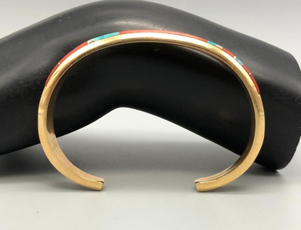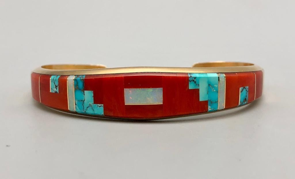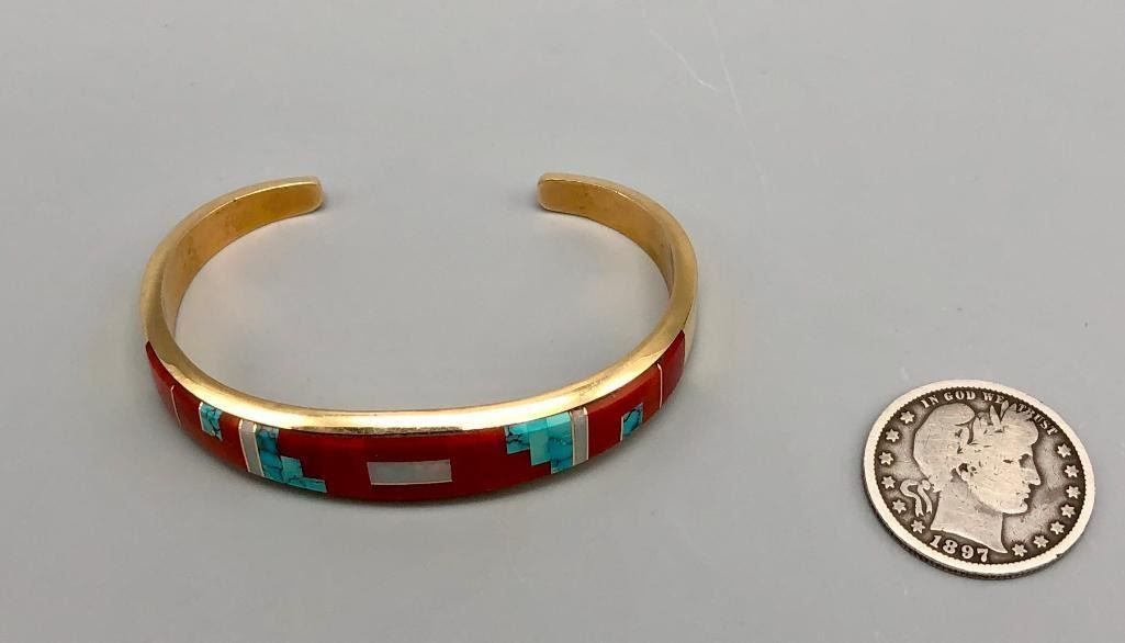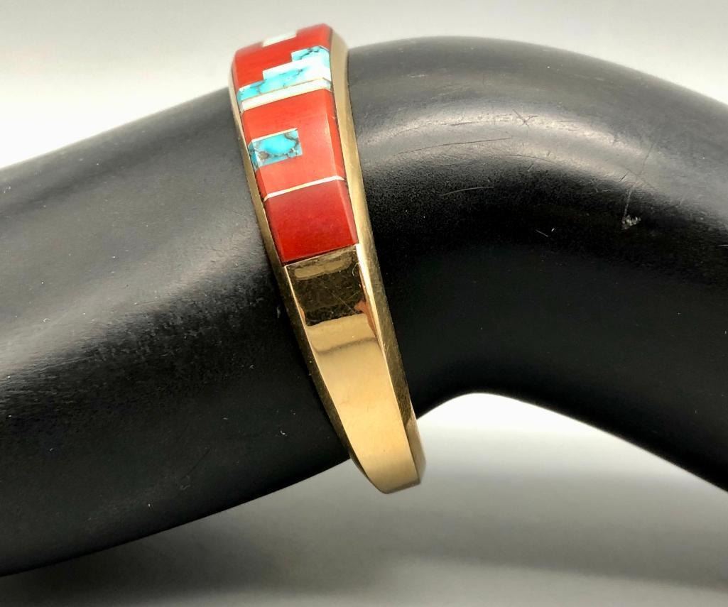 Offered for sale in this lot is a wonderful Wayne Muskett gold inlay bracelet. This is a beautiful 14k gold bracelet set with coral, turquoise, and opal. The inlay has a stunning flush finish with fine gold work in between. This is an exquisite piece of work that will go with most anything. It is stamped 14k.  MAKER: Hallmarked Muskett. Wayne Muskett (Navajo). APPROX AGE: Fairly modern. SIZE: Inside circumference measures 5-1/8 inches long. Opening is an additional 1 inch fitting a 6-1/8 inch wrist. Width is 1/2 inches. Weighs 20.6 grams. CONDITION: Good for its age, normal wear expected. Please look closely at the pictures as they are an important part of our description and are hereby incorporated into the description, specifically with regards to condition. SHIPPING: There will be a $5 handling / packaging fee for shipping this lot. The actual cost of postage will be added on top of that. BUY IT NOW: If you would like to buy this item now, without waiting for the auction day to bid on it, we do offer this option (which is available up to 48 hours before the actual auction starts). The “Buy it Now†price is the high estimate of this lot (plus applicable fees and the Buyer's premium is discounted to 10% when using the Buy it Now option). If you would like to exercise this option, you must contact us by email (or phone as long as you talk to someone live). Reference this lot number and your intention to "Buy it Now."