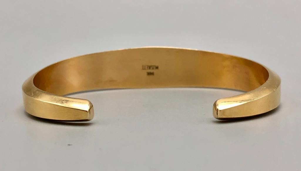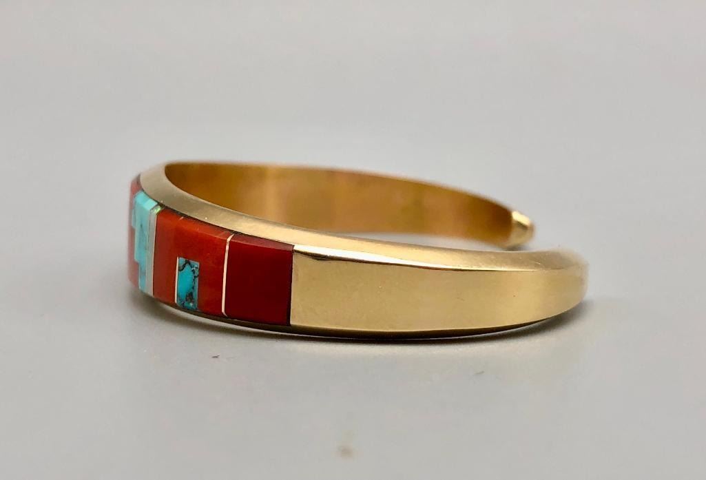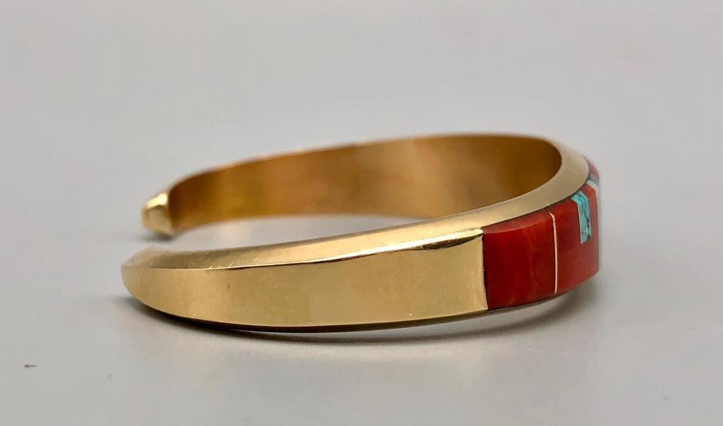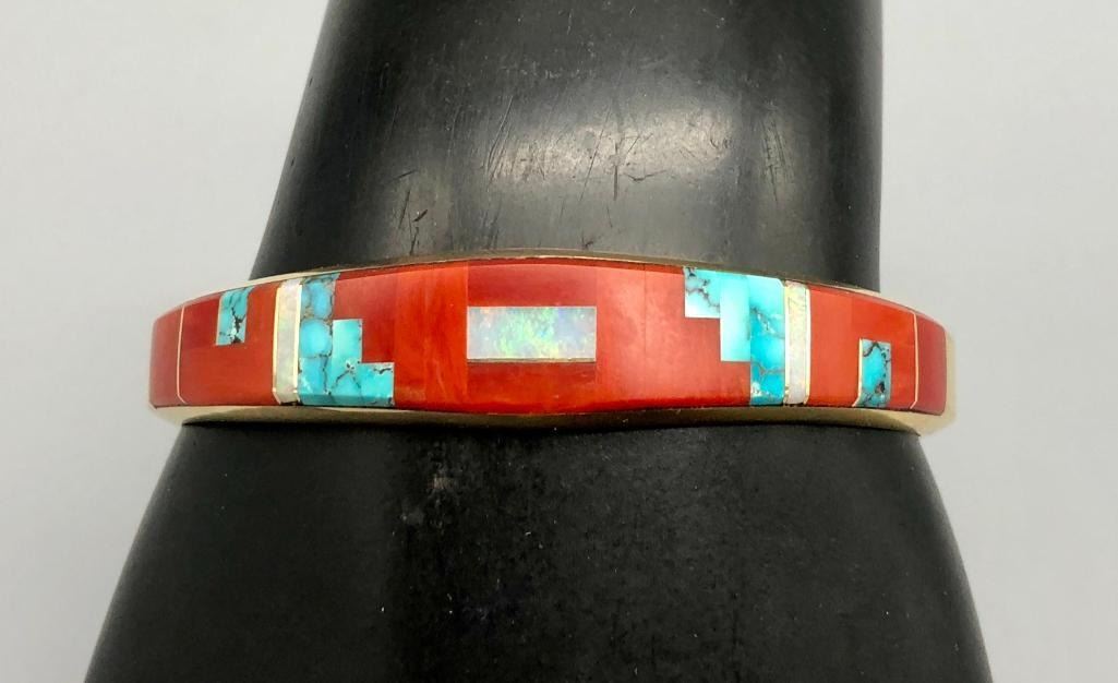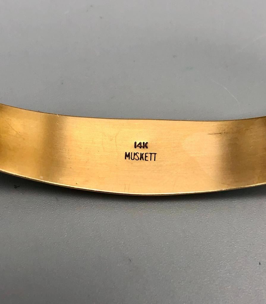 Offered for sale in this lot is a wonderful Wayne Muskett gold inlay bracelet. This is a beautiful 14k gold bracelet set with coral, turquoise, and opal. The inlay has a stunning flush finish with fine gold work in between. This is an exquisite piece of work that will go with most anything. It is stamped 14k.  MAKER: Hallmarked Muskett. Wayne Muskett (Navajo). APPROX AGE: Fairly modern. SIZE: Inside circumference measures 5-1/8 inches long. Opening is an additional 1 inch fitting a 6-1/8 inch wrist. Width is 1/2 inches. Weighs 20.6 grams. CONDITION: Good for its age, normal wear expected. Please look closely at the pictures as they are an important part of our description and are hereby incorporated into the description, specifically with regards to condition. SHIPPING: There will be a $5 handling / packaging fee for shipping this lot. The actual cost of postage will be added on top of that. BUY IT NOW: If you would like to buy this item now, without waiting for the auction day to bid on it, we do offer this option (which is available up to 48 hours before the actual auction starts). The “Buy it Now†price is the high estimate of this lot (plus applicable fees and the Buyer's premium is discounted to 10% when using the Buy it Now option). If you would like to exercise this option, you must contact us by email (or phone as long as you talk to someone live). Reference this lot number and your intention to "Buy it Now."