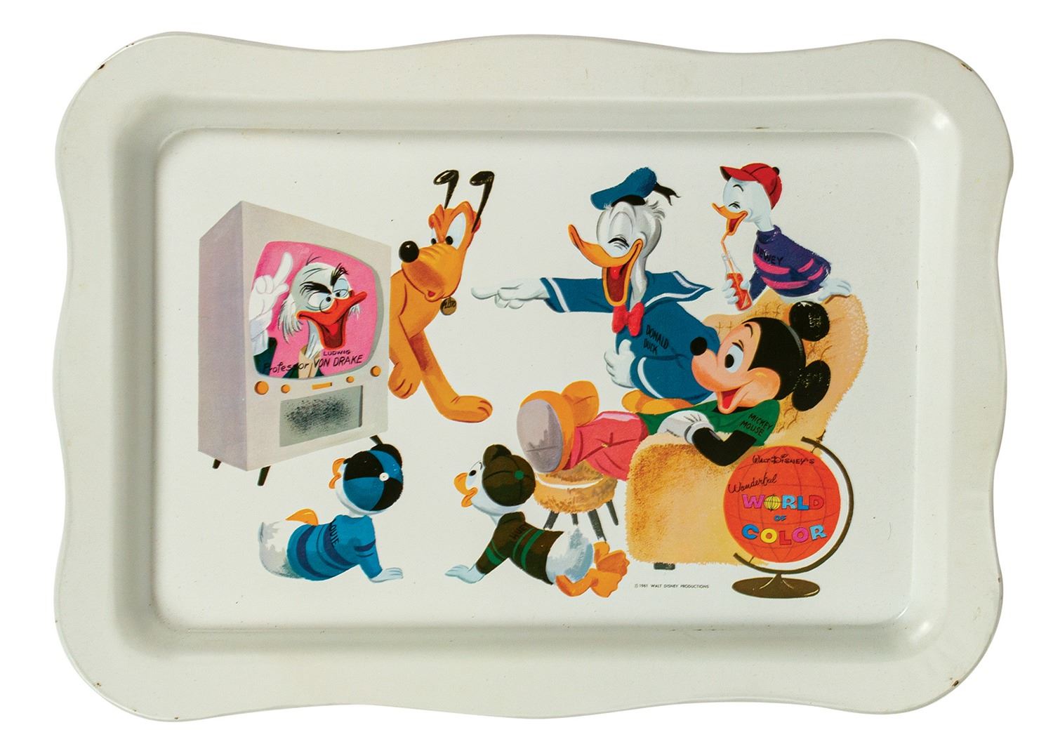 (Disney, 1961) A Wonderful World of Color themed tin-litho TV tray. This tray was made to promote Walt Disney's Wonderful World of Color which debuted that same year, and measures 12.75"x17.5". The tray is in good condition overall with minor dings to the front and minor scratching to the back.