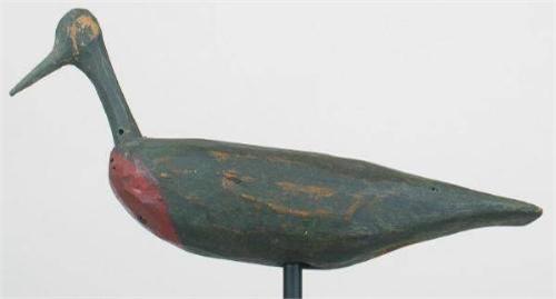Wonderful delicate primitive root head knot decoy ca 1890-1900 probably from North Carolina. In strong original paint that is simple but effective with gray on the body and head and red on the breast. Struck by a few shot. Head will separate from the body. Old tiny worm holes are inactive. This example came out of a Duxbury collection that was put together back in the 40's and 50's. Many of the decoys were acquired directly from Bill Mackey. This is the real thing so take a good look at the surface as it should look. Hundreds of these two-piece primitives have been carved and chemically aged in the last few decades. (decoy)