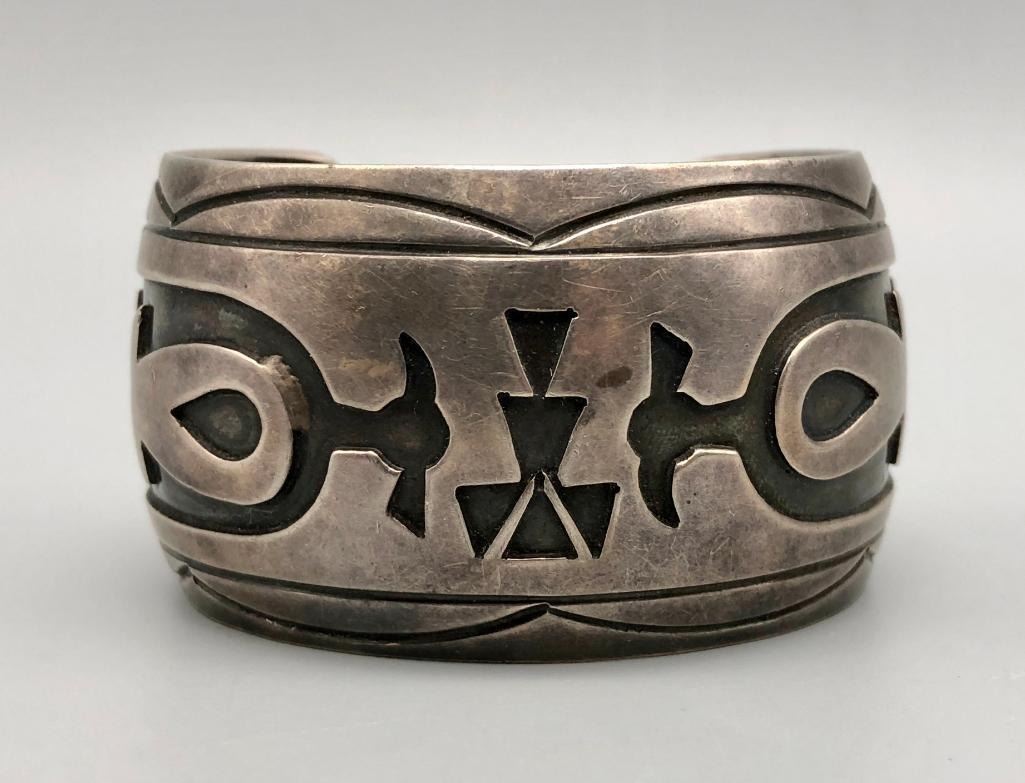 Presented for sale in this lot is a wonderfully wide sterling silver, overlay bracelet. This great bracelet features an impeccable overlay bird pattern with lovely symmetrical designs. It is sterling silver and can easily be worn all day with most anything. MAKER/ARTIST: Unmarked. APPROX AGE: Circa 1970s. SIZE: Inside circumference measures 6-1/2 inches long. Opening is an additional 1-1/4 inches, fitting a 7-1/2 inch wrist. Width is 1-1/2 inches. Weighs 60.1 grams. CONDITION: Good for its age, normal wear expected. Please look closely at the pictures as they are an important part of our description and are hereby incorporated into the description, specifically with regards to condition. SHIPPING: There will be a $5 handling / packaging fee for shipping this lot. The actual cost of postage will be added on top of that. BUY IT NOW: If you would like to buy this item now, without waiting for the auction day to bid on it, we do offer this option (which is available up to 48 hours before the actual auction starts). The “Buy it Now†price is the high estimate of this lot (plus applicable fees and the Buyer's premium is discounted to 10% when using the Buy it Now option). If you would like to exercise this option, you must contact us by email (or phone as long as you talk to someone live). Reference this lot number and your intention to "Buy it Now."