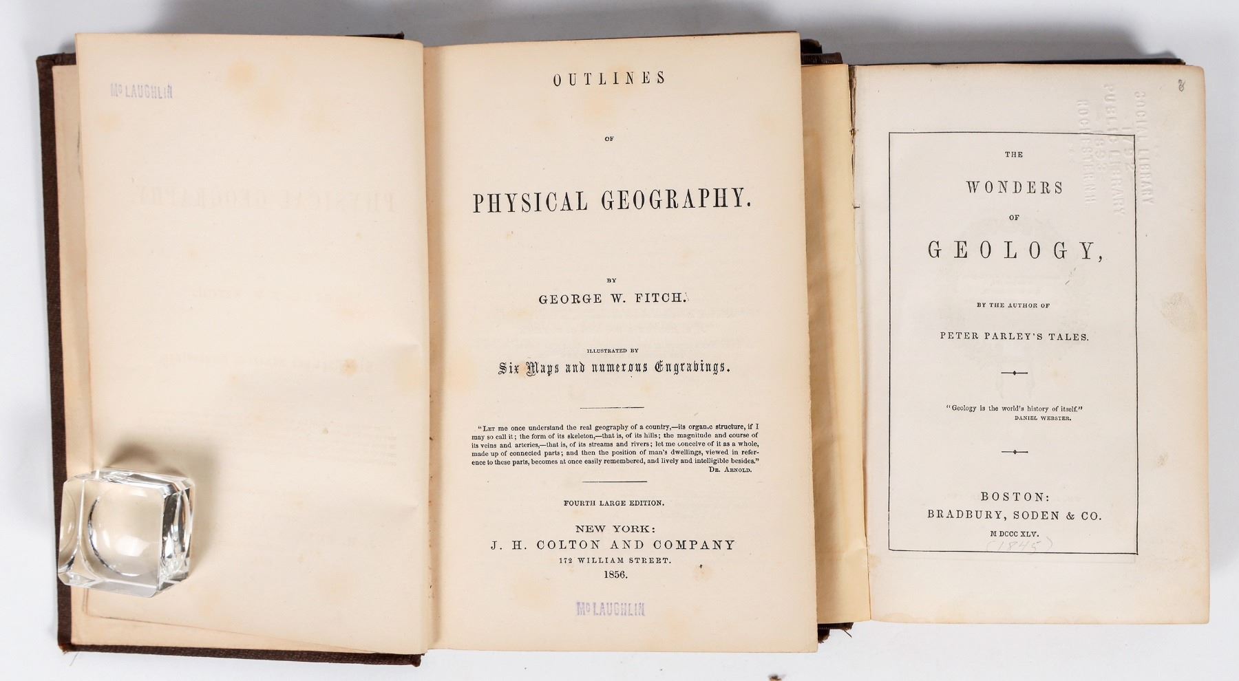 Lot of 2 different. Rare. 1) Outlines of Physical Geography. By George W. Fitch. Illustrated by Six Maps and numerous Engravings. 1856. JH Colton & Co. 225pp. Some toning, age discoloration. 7.75 x 5.25" 2) The Wonders of Geology, By the Author of Peter Parley's Tales. 1845. Bradbury, Soden & Co. 291pp. Geology over 100 years before plate tectonics!