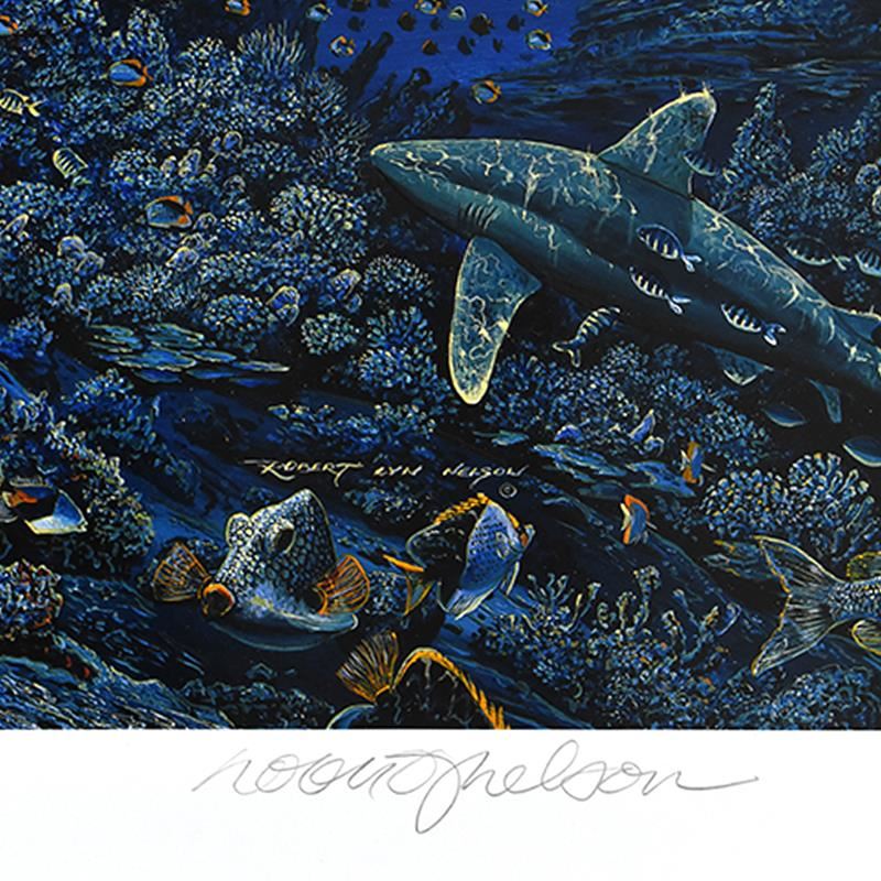 "Wonders of Mahea-Lani" is a limited edition mixed media on paper by Robert Lyn Nelson, numbered and hand signed by the artist. Includes Letter of Authenticity. Measures approx. 34" x 27" (with border), 30" x 22" (image).