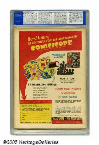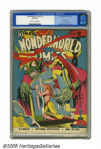 <B>Wonderworld Comics #13 (Fox, 1940) CGC FN 6.0 Cream to off-white pages.</B></I> This was the last of the classic run of Lou Fine covers in this series. Fine's colleague Will Eisner contributed art to this issue. This comic also marked the end of the backup feature starring Asian sleuth Dr. Fung. Overstreet 2005 FN 6.0 value = $345. CGC census 6/05: 1 in 6.0, 1 higher.