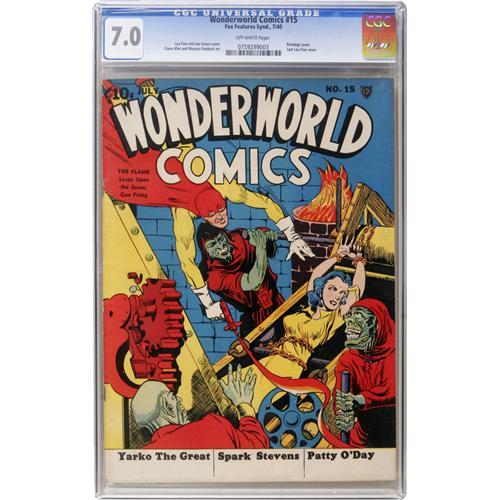 <B>Wonderworld Comics #15 (Fox, 1940) CGC FN/VF 7.0 Off-white pages.</B></I> This bondage cover was a collaboration of two greats, Joe Simon (pencils) and Lou Fine (inks). Overstreet 2006 FN 6.0 value = $345; VF 8.0 value = $719. CGC census 3/07: 1 in 7.0, 3 higher. <I> From the Cary and Cheryl Porter Collection.</B></I><BR><BR><b>Shipping:</b> Comics - Slabbed (certified) (<a target="_blank" href="http://www.heritageauctions.com/common/shipping.php">view shipping information</a>)
