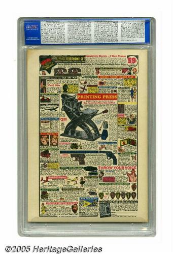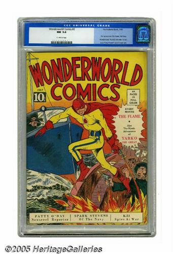 <B>Wonderworld Comics #3 (Fox, 1939) CGC NM 9.4 Off-white pages.</B></I> This 9.4 copy is the best one available according to CGC's census, and seldom has the margin been so wide, with the only other unrestored copy as of this writing checking in at 2.0. This is the first issue of the title (with the numbering continued from <B>Wonder Comics</B></I>), and it features the first appearance of the Flame, drawn by Lou Fine. That flamethrower-wielding hero actually predates the first appearance of the fiery Human Torch in <B>Marvel Comics</B></I> #1! The comic was the work of the Eisner-Iger studio, which means big-name artists participated, among them Will Eisner, Bob Powell, and the great Fine. The cover of this tough-to-find issue, a Gerber "7," is a collaboration between Eisner and Fine. Overstreet 2005 NM- 9.2 value = $10,200. CGC census 6/05: 1 in 9.4, none higher.