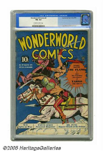 <B>Wonderworld Comics #4 (Fox, 1939) CGC FN+ 6.5 Off-white to white pages.</B></I> The superb skills of Lou Fine are in display on this issue's cover. The interior is the work of the Eisner-Iger shop, that means great art by Will Eisner, Lou Fine, and Bob Powell. This is one of only two unrestored copies that CGC has certified to date. Overstreet 2005 FN 6.0 value = $951; VF 8.0 value = $2,061. CGC census 6/05: 1 in 6.5, 1 higher.