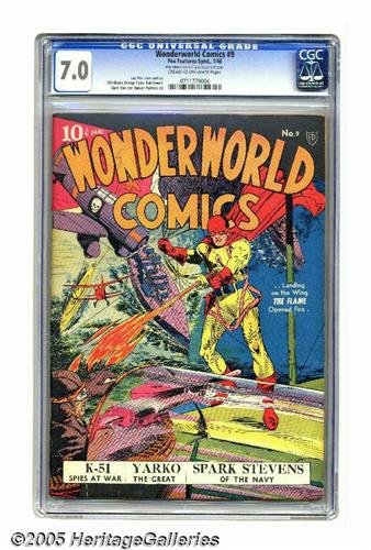 <B>Wonderworld Comics #9 (Fox, 1940) CGC FN/VF 7.0 Cream to off-white pages.</B></I> Surprisingly colorful covers on these early issues of Fox's first comic book run (first three issues were <B>Wonder Comics</B></I>), but the real attraction was the distinctive art by Lou Fine. Fine also contributed interior art, as did familiar names Will Eisner, George Tuska, and Bob Powell. This one's a tough find in high grade; in fact you're looking at the highest CGC-certified grade to date. CGC notes, "Very minor amount of glue on spine of cover." Overstreet 2005 FN 6.0 value = $543; VF 8.0 value = $1,131. CGC census 6/05: 1 in 7.0, none higher.