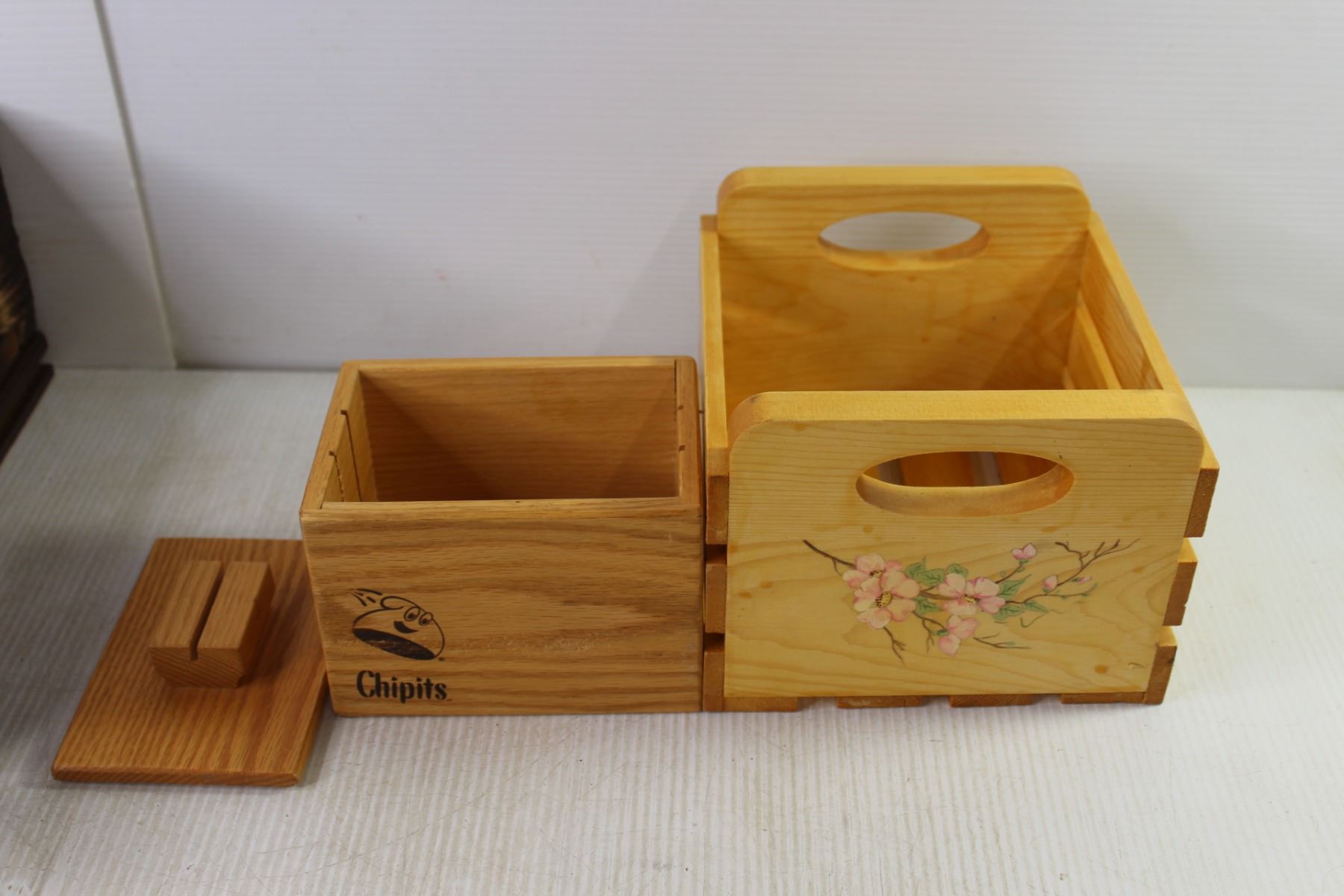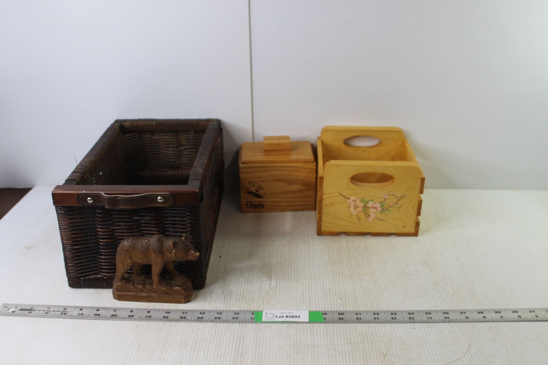 Wood Bear Figurine, (2) Wood Boxes, Wicker Box