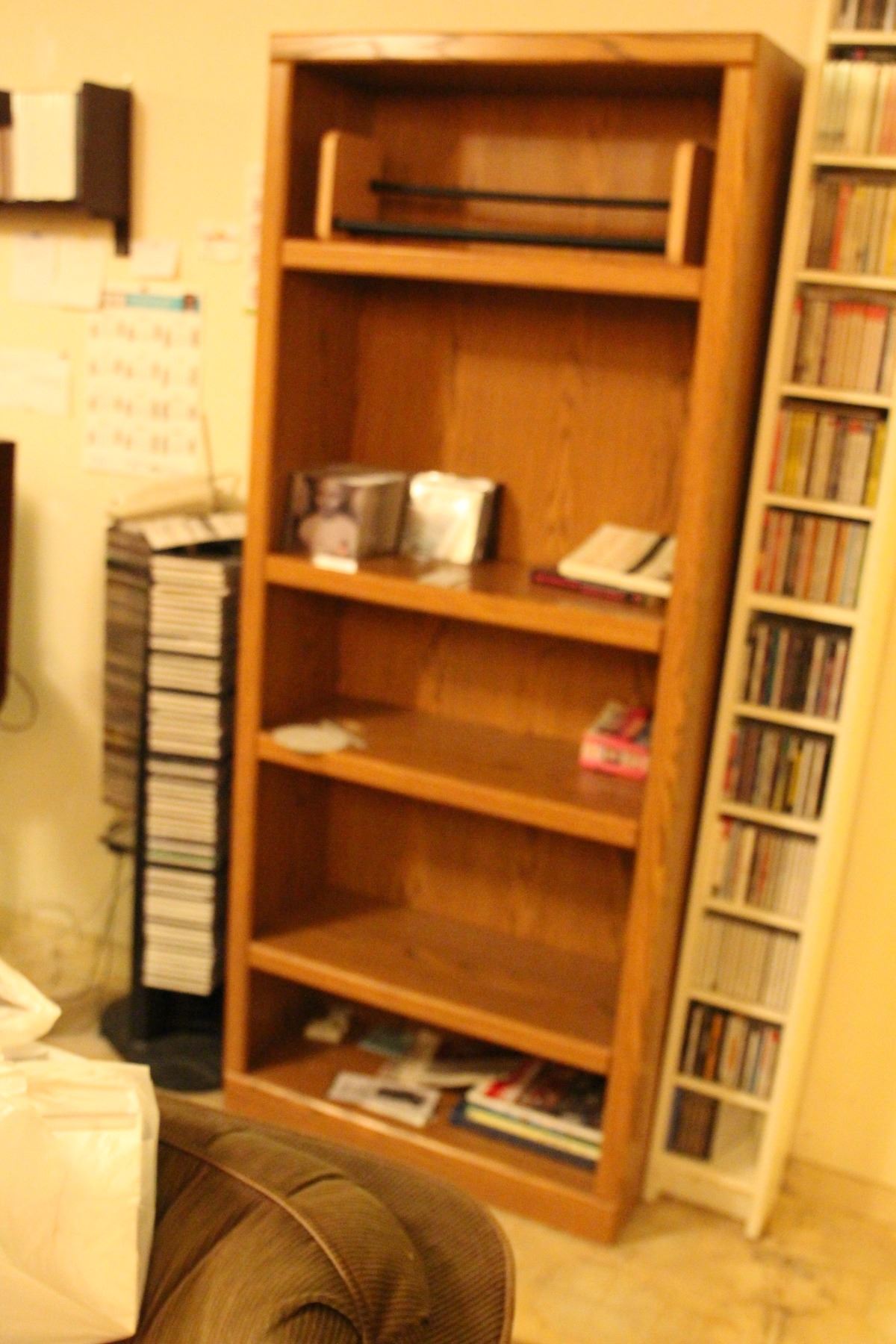 Wood bookshelf 30X12x72, plus contents. Bring help to remove from home & pickup at 10:00 - 11:00 am