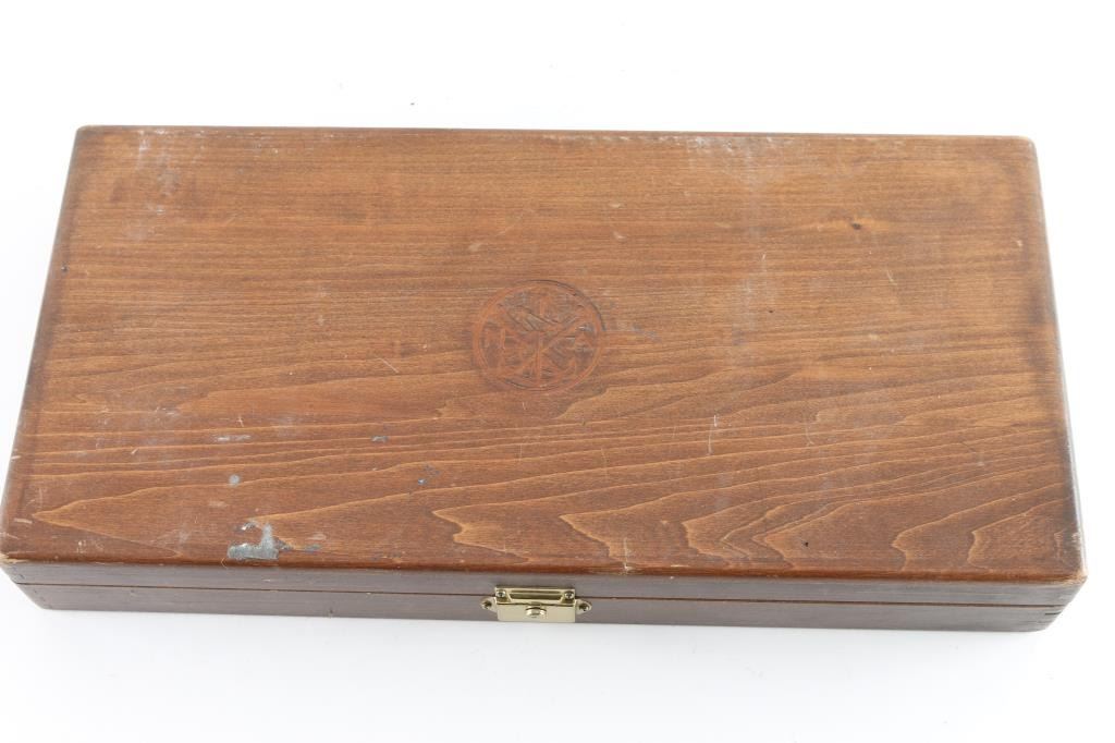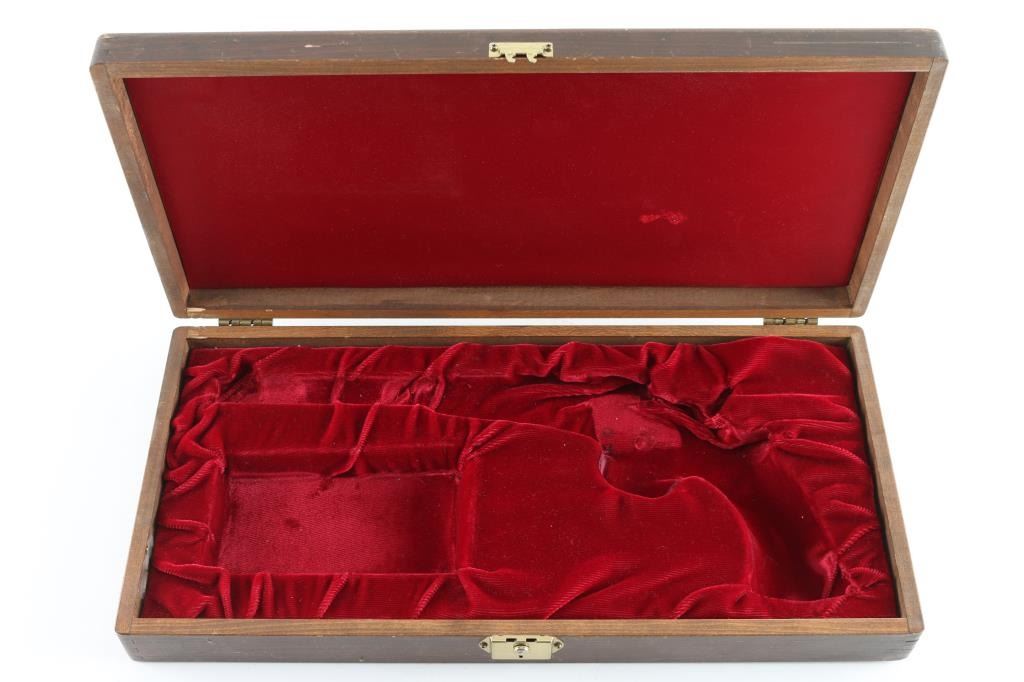 with Navy Arms logo on lid. Red cloth fitted case for a smaller framed Rolling Block pistol with approx 8 or 9" barrel. Good condition with scuffs and other signs of handling.