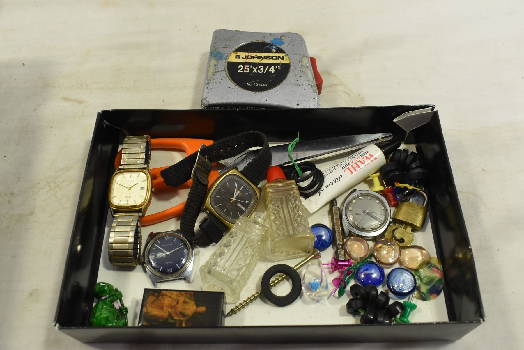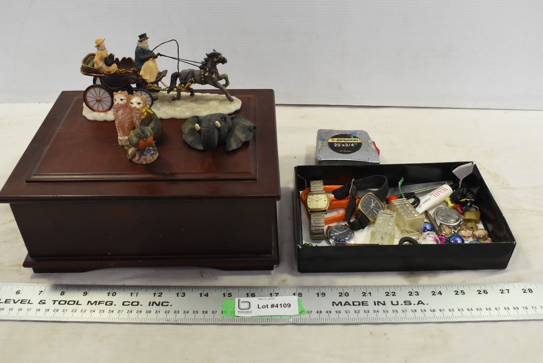 Wood Box w/ Assorted ornaments, watches & Misc.