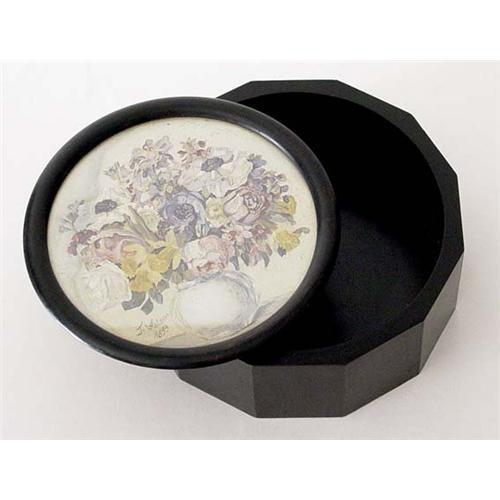 Lovely black wood box with round cover decorated with a still-life watercolor of flowers signed J. Watson and dated 1898. In very good, used condition. There is a listed painter by the name of James Watson who was alive on that year but we have no evidence that it refers to the same person who painted this watercolor. Please ask questions, request additional photos and shipping costs before bidding.