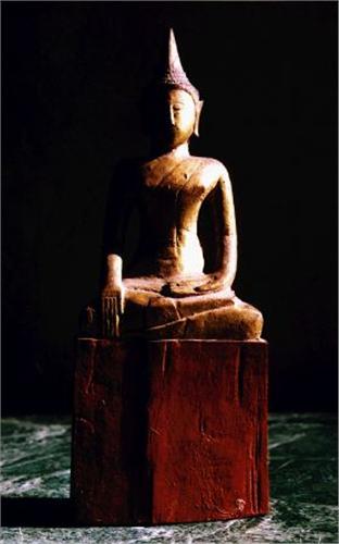 Wood Buddha. C. 1750, in seated position, from Siam (Thailand). On platform, overall about 12" high including base. Carved from a single piece of wood. Red base with gold Buddha. Siamese text hand etched on base front; headdress intricately carved. Buddha 8" high plus base 4 -1/2 ". Exported about fifty years ago, conforming with "National Treasure" antiquities regulations. Exquisite.