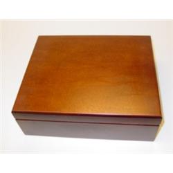 Wood cigar box and contents. Dark walnut finish. Includes four pocket size cigar holders. 10-3/8" x 8-1/2" x 3-3/4". Condition: Very Good. Light scratches on lid.