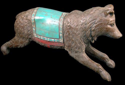 Wood Carousel bear w/green saddle & stirrup, circa 1890