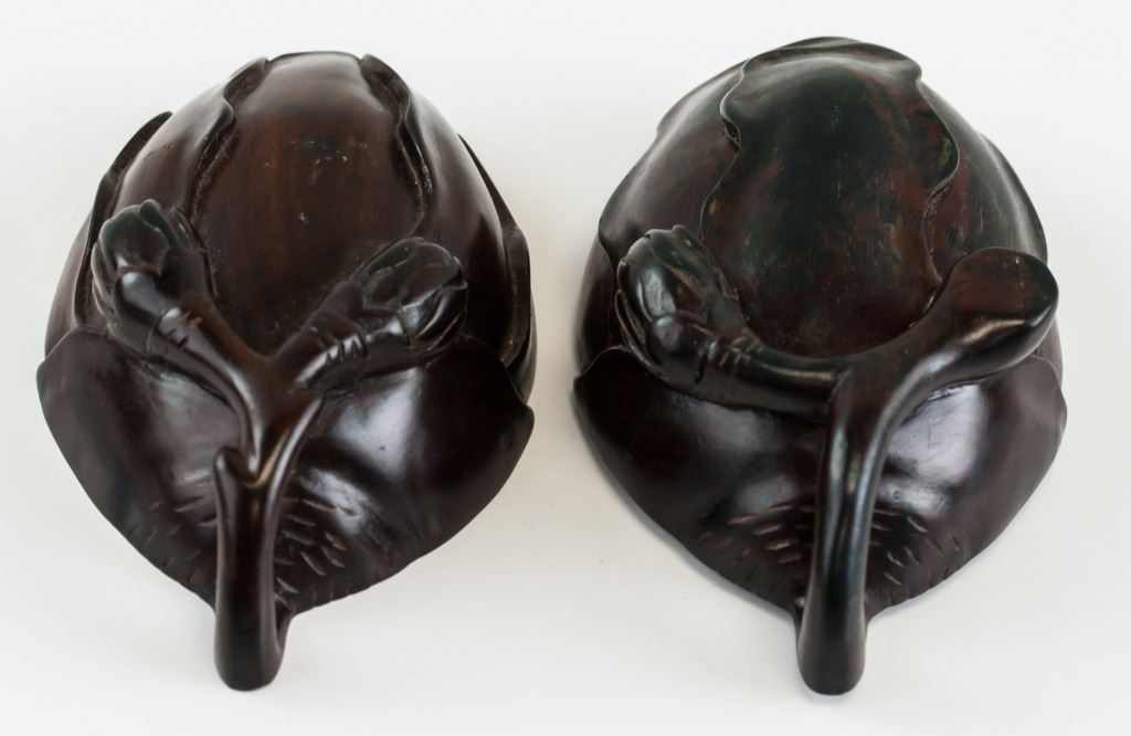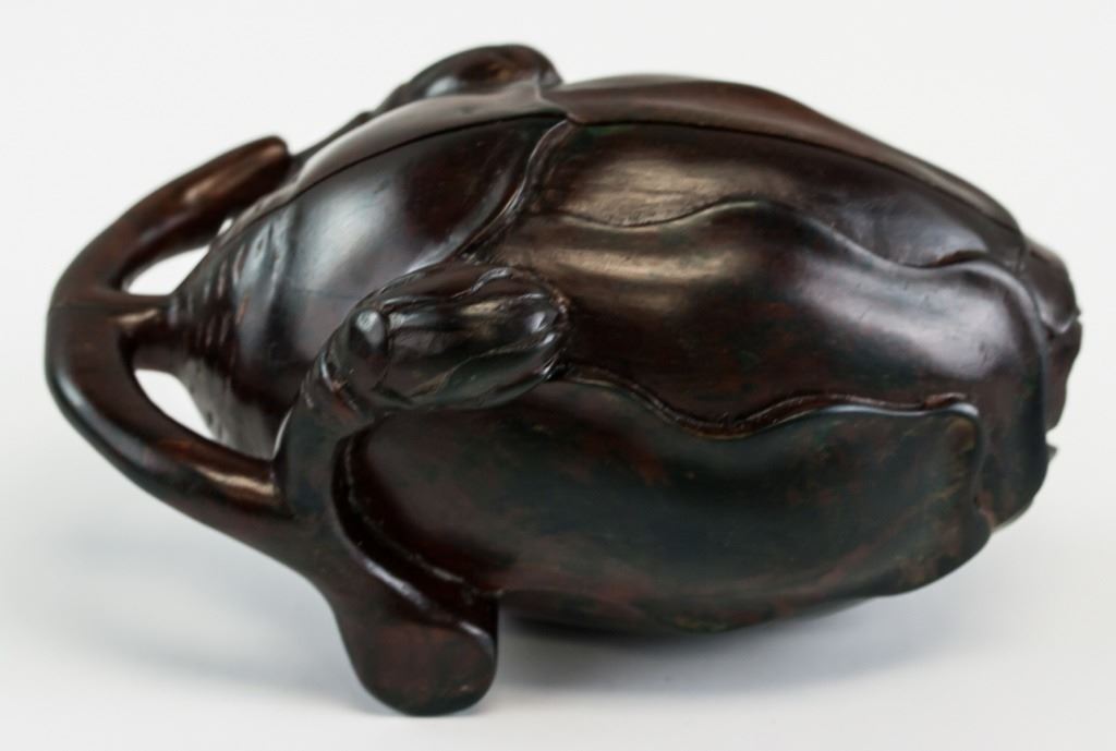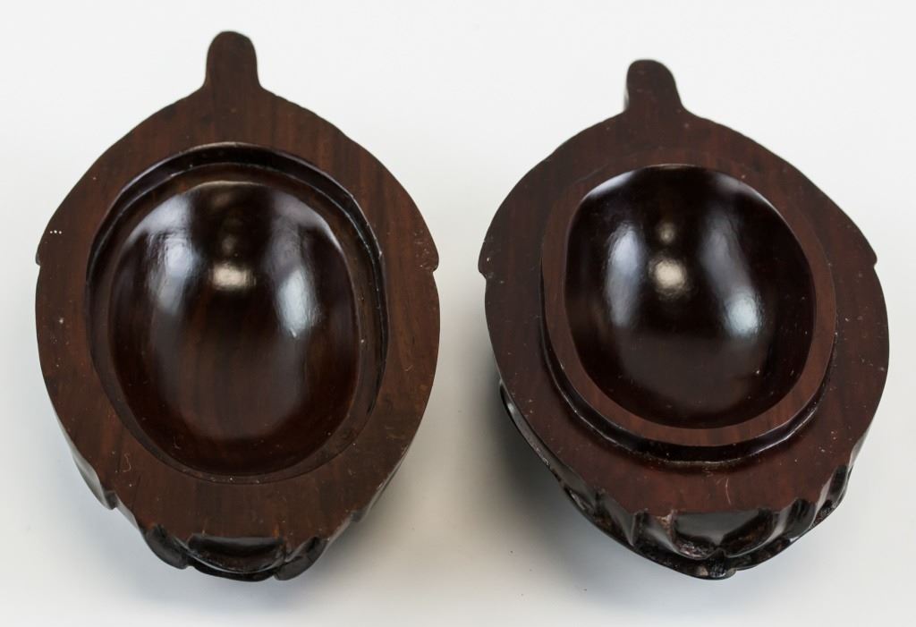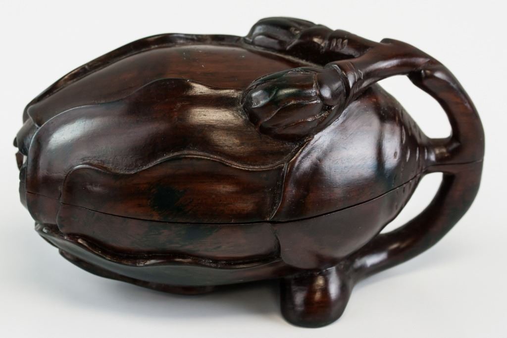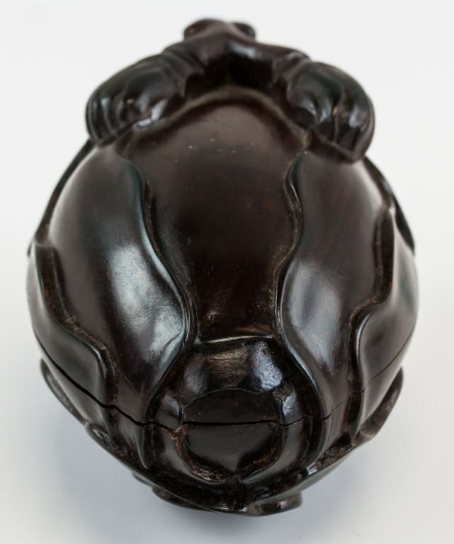 Wooden case. Of deep brown tone. Carved in flower bud shape. 7 x 12 cm. 218 grams.