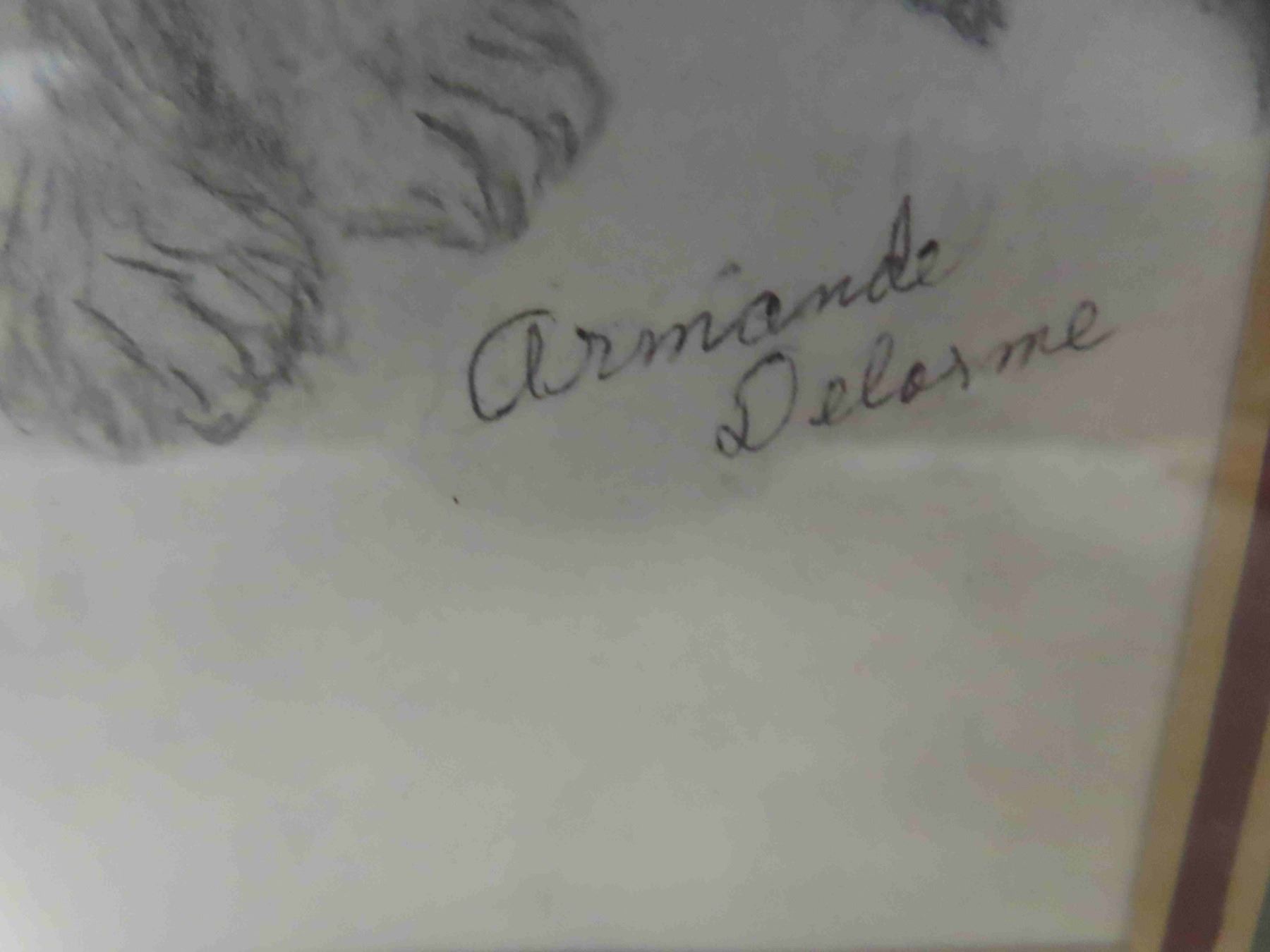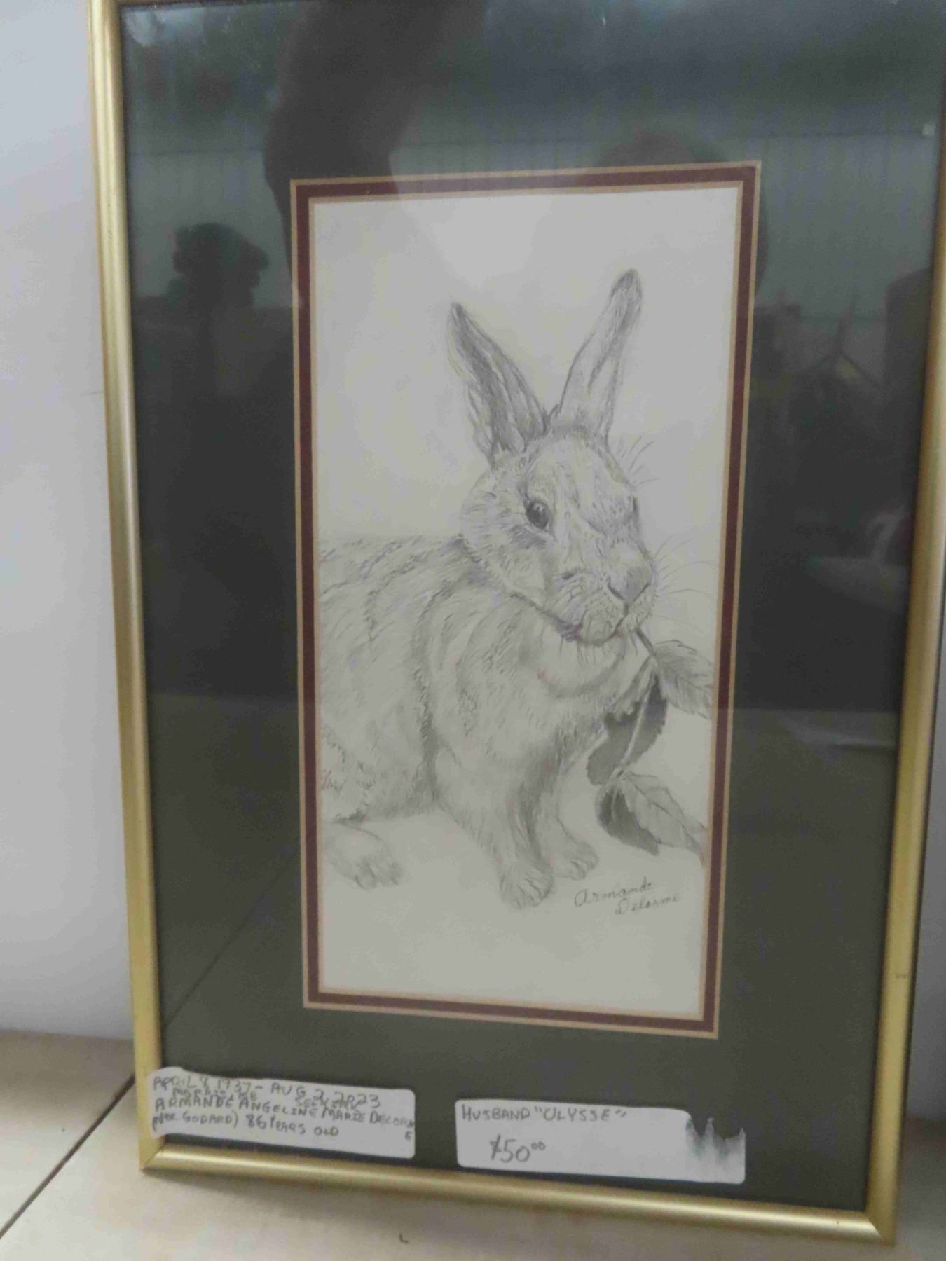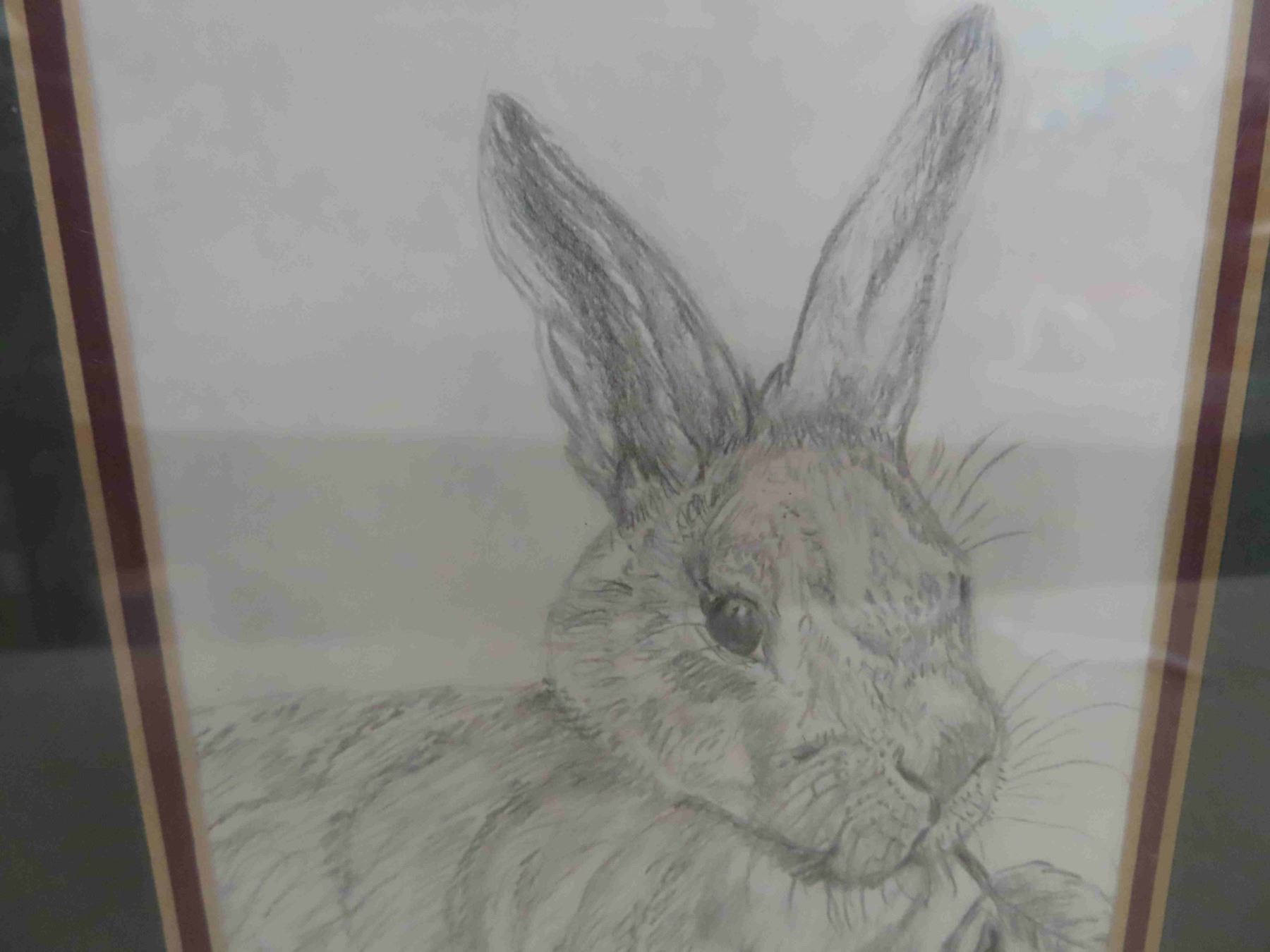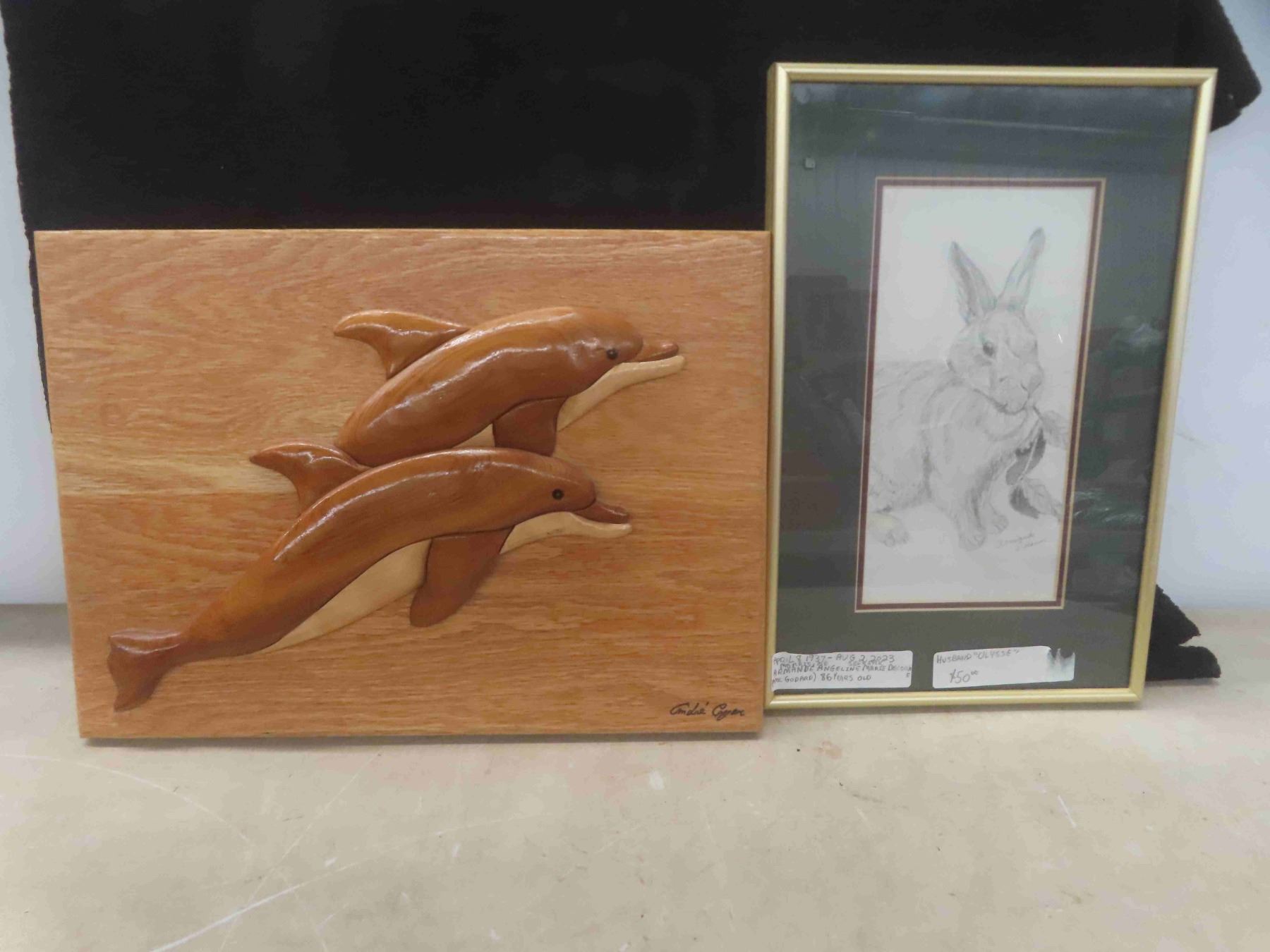 Wood Carving of Dolphin Picture Signed 15 1/2'' x 11'' , Original Pencil Sketch of a Hare by Armande Decorme