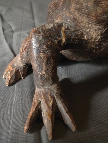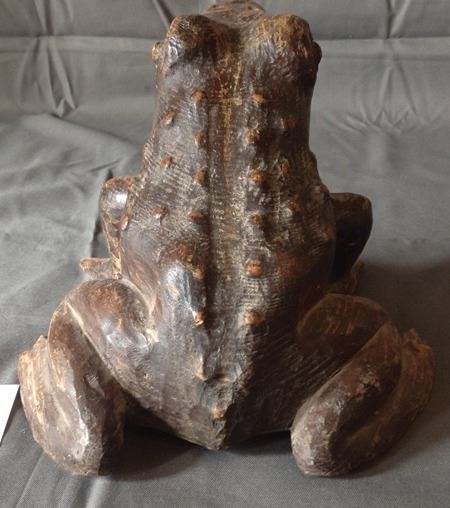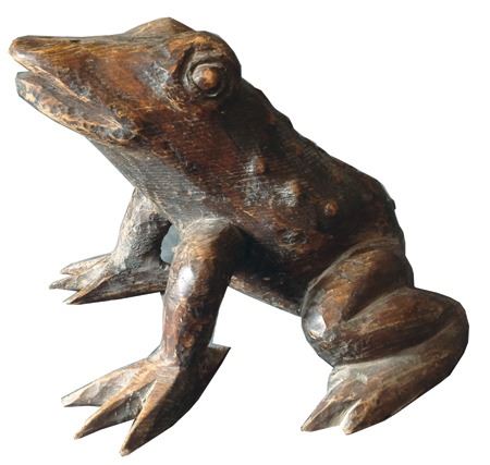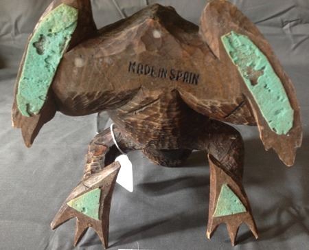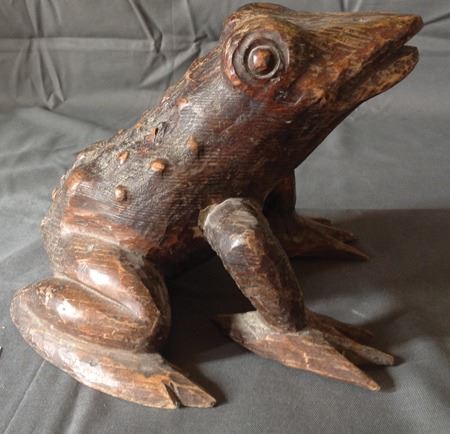 Antique, Nicely hand carved wooden frog sculpture from Spain. Fair condition, one leg is glued. 7" x 9" x 9"
