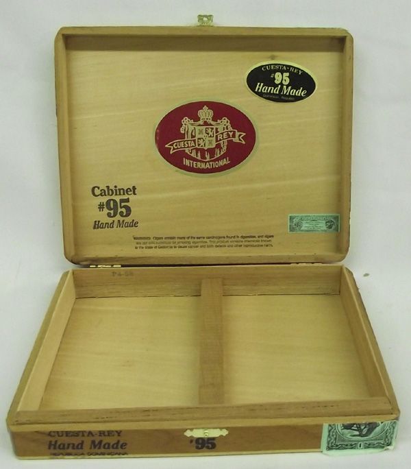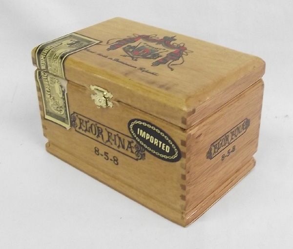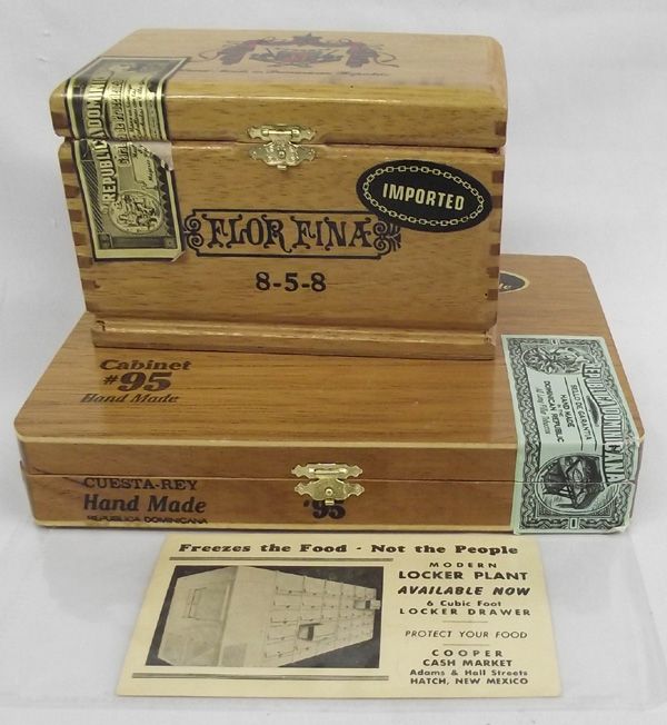 Wood Cigar Boxes & 1 Cent Postcard. Largest cigar box measures 7'' high x 9'' wide, ''Flor Fina'' from the Dominican Republic, great label inside the lid. Second box is also from the Dominican Republic, ''Cuesta Rey International''. The 1 cent post card is not cancelled and is an advertising piece from the Cooper Cash Market in Hatch, New Mexico, advertising food locker space for freezing foods. Clean piece.