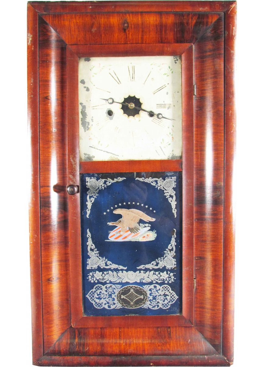 Wood Clock with Tin Litho dial and Eagle Motif Reverse Painted Glass door. Wear to tin litho and paint loss on dial. Comes with pendulum. 16 1/2 X 29 X 4 inches.