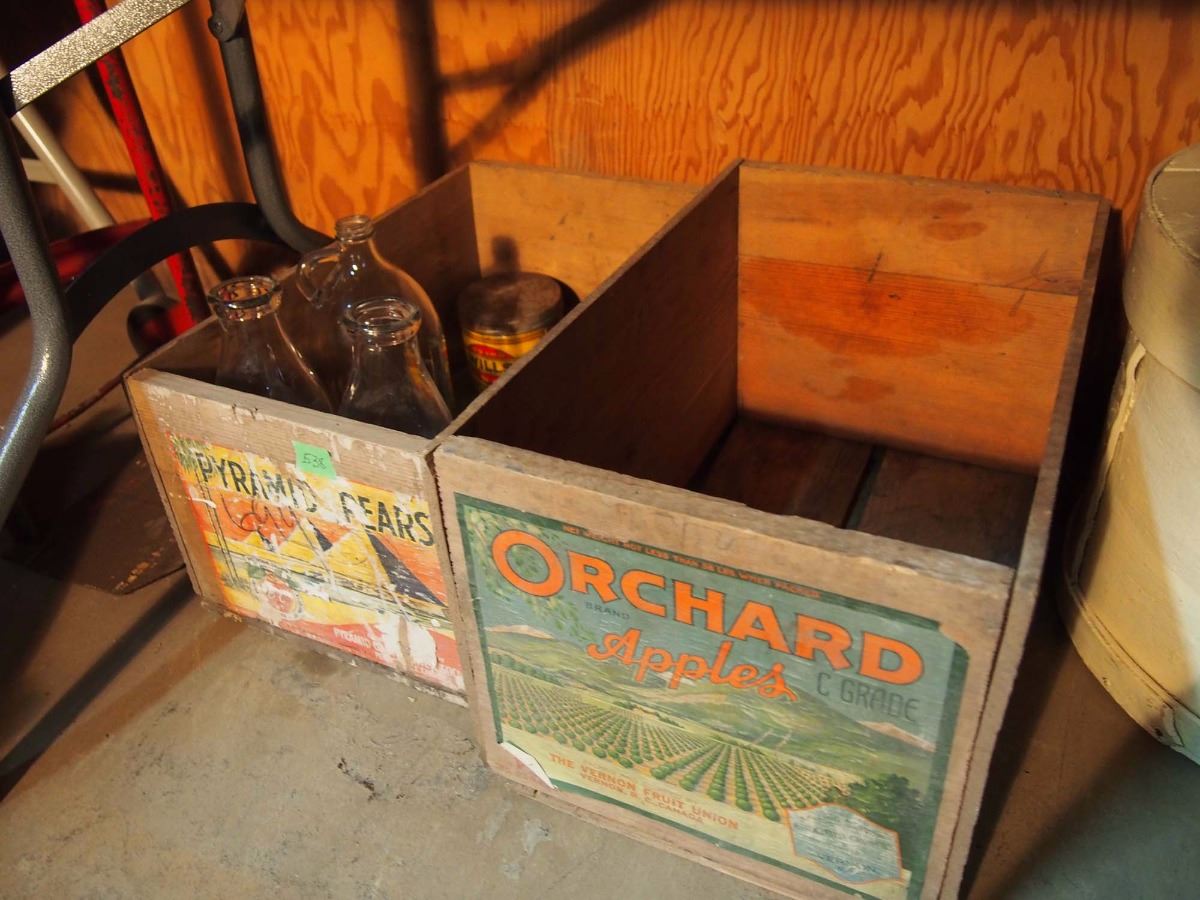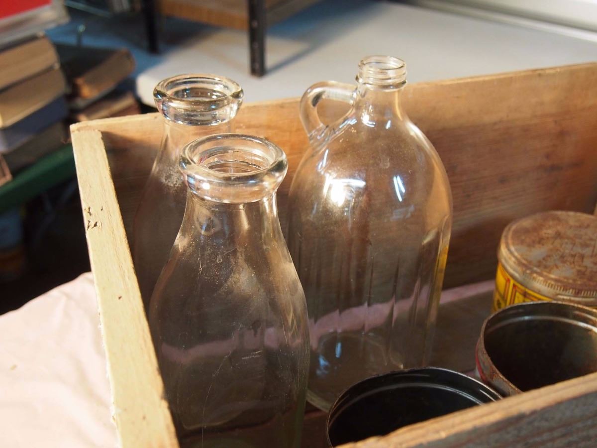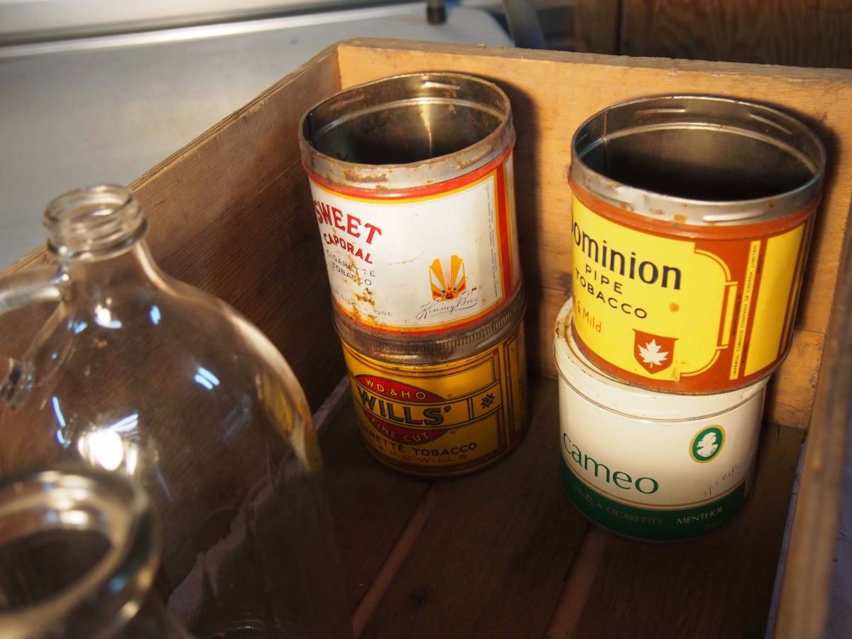 Wood Crates (2), Milk Bottles, Ciggerate Tins