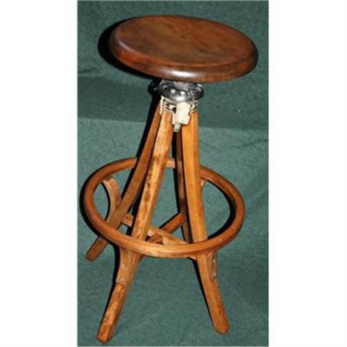 Fabulous old Drafting Stool. It is made of mixed hardwoods with a cast iron acme screw mechanism. There is a footrest ring and gently curved legs which makes for pleasing lines. <p> The hight is adjustable. It goes from approx 30" to 35" tall give or take a little. It is 17 3/4" wide meausring across at the widest point which is the foot rest ring. <p> There is no manufacturers marks. It is very well crafted. <p> When I obtained it many years ago it was painted. The painted was a textured "crinkle" paint that looked like sawdust or wood chips. It was kind of funky. I comptemplated selling is as is but thought best to strip it. My husband has totally refinished the wood with 100% plant based natural finish. There is still some of the old paint left on the iron parts. <p> The condition is excellent with the exception of of the old paint left on the iron. <p><p>