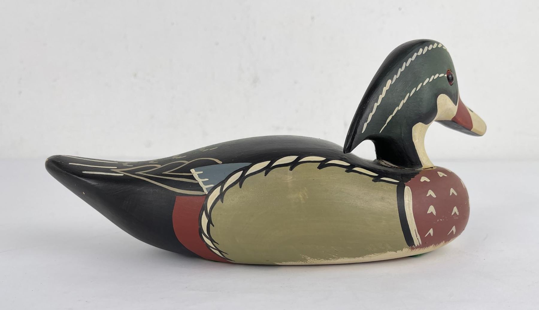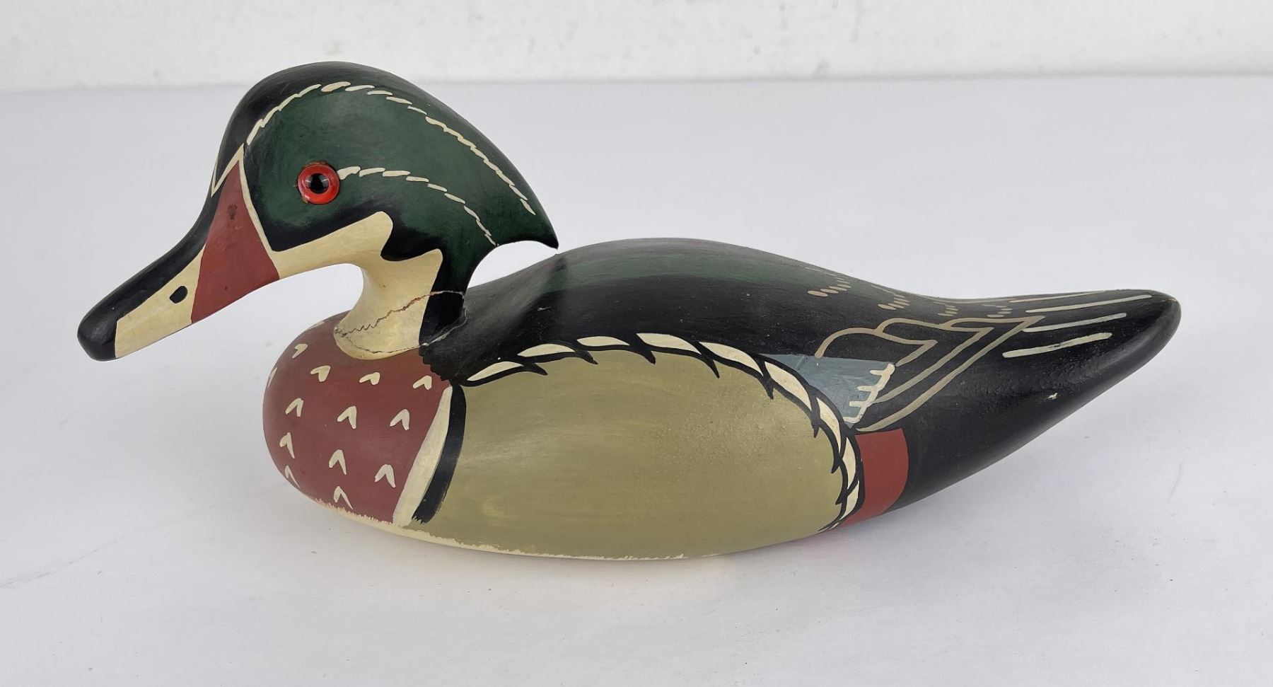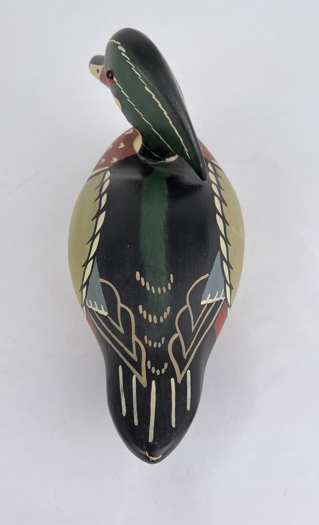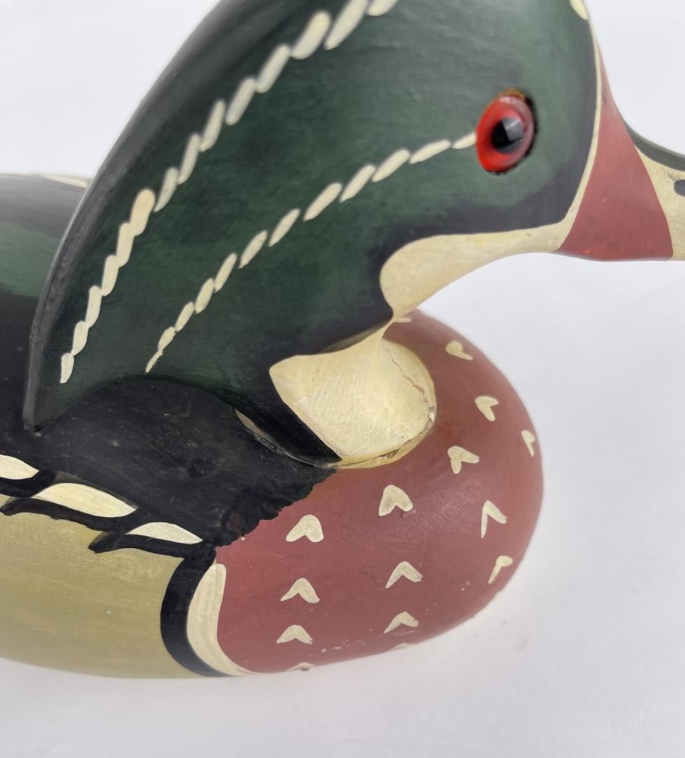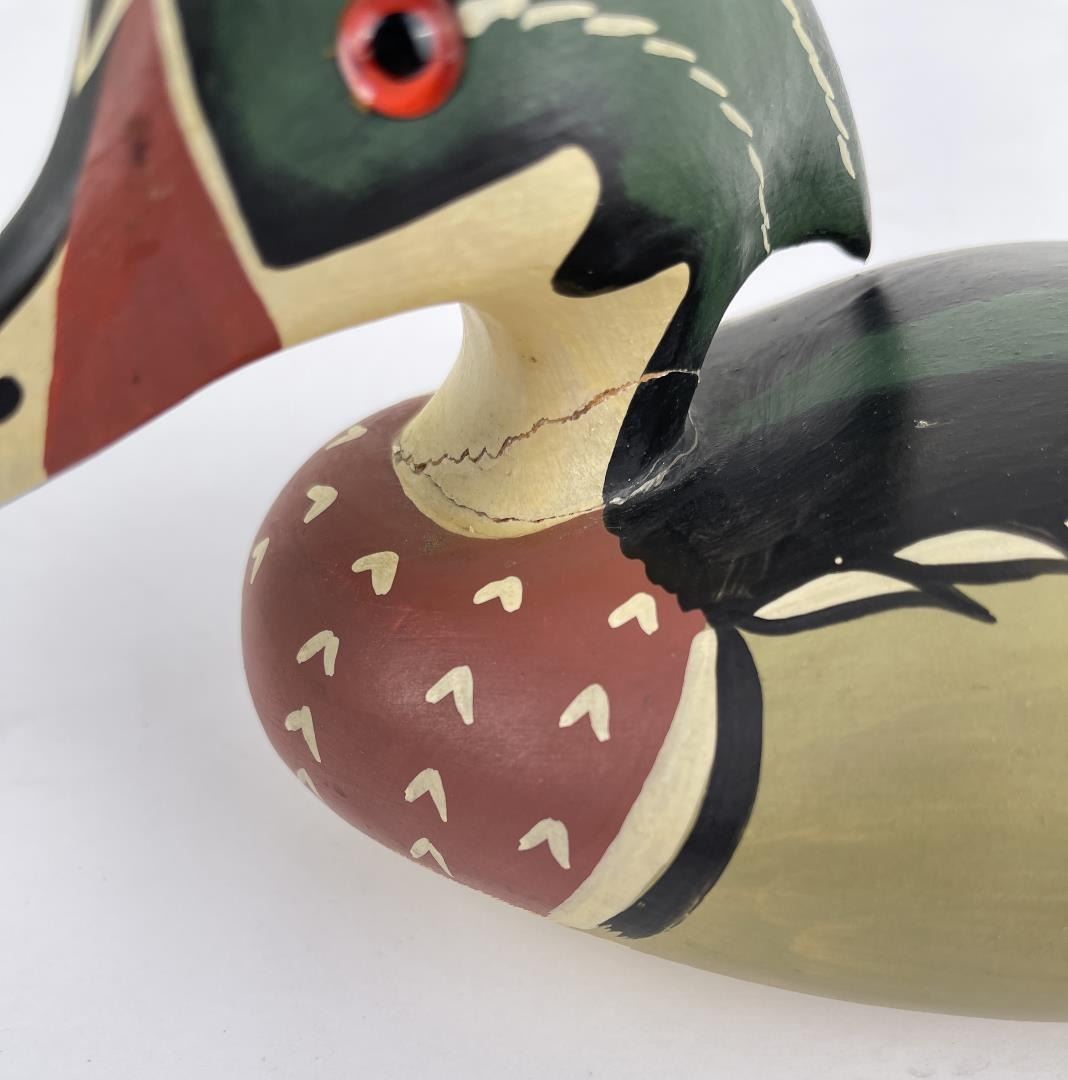 Nice custom made duck decoy. Signed as shown. 11" long, neck has been broken and repaired.