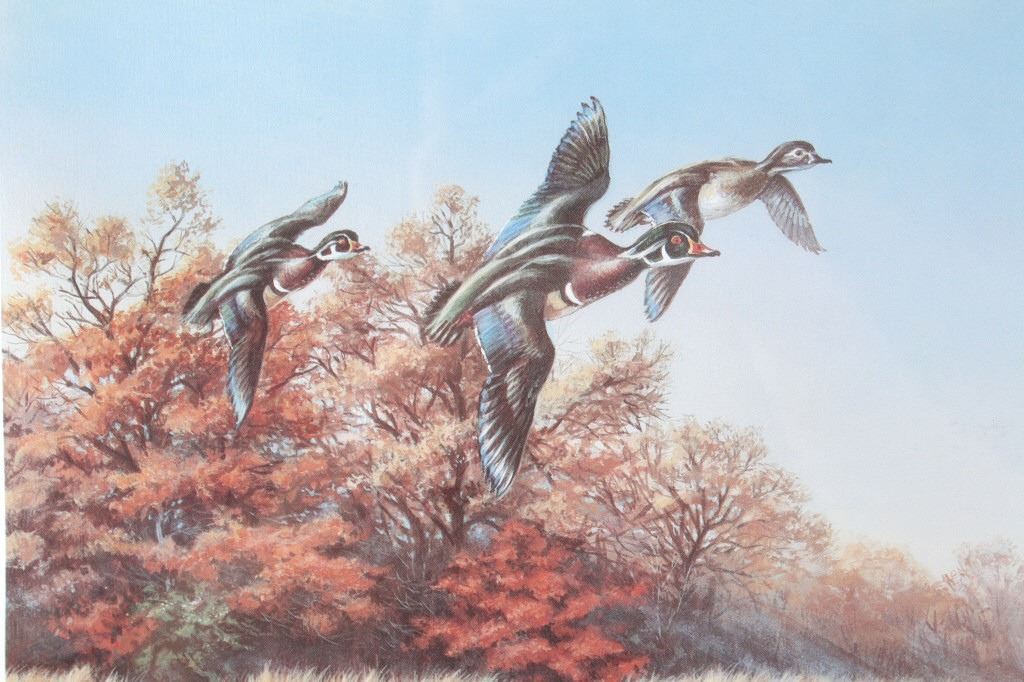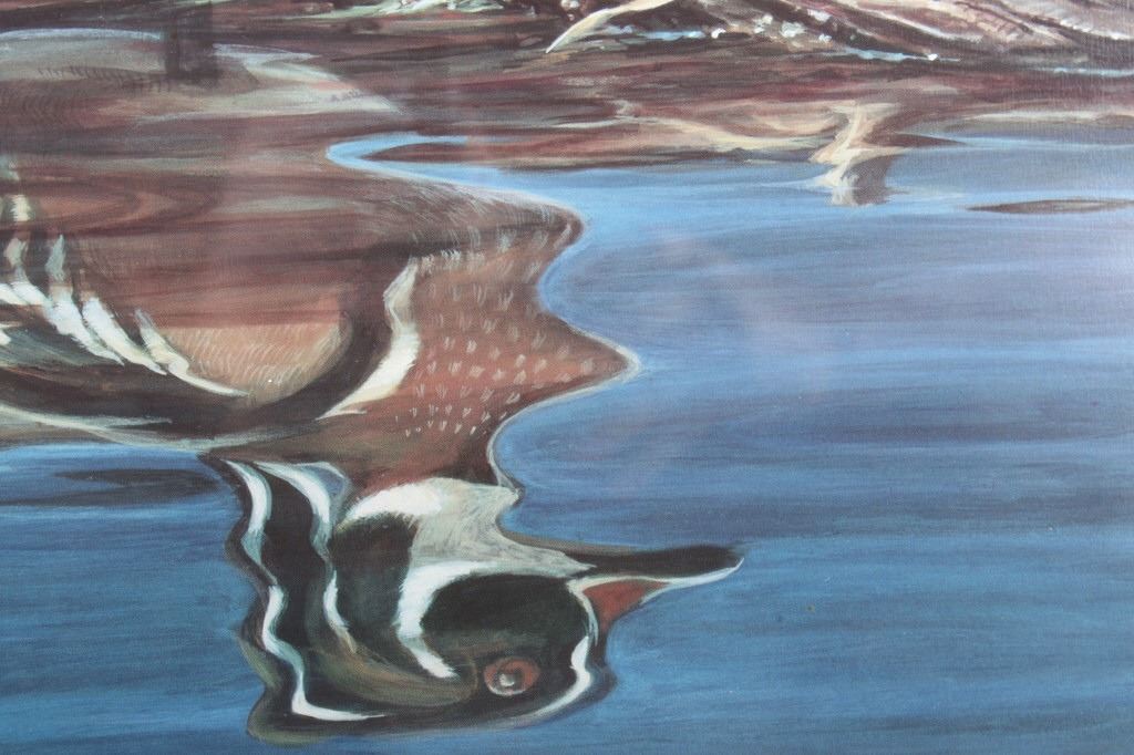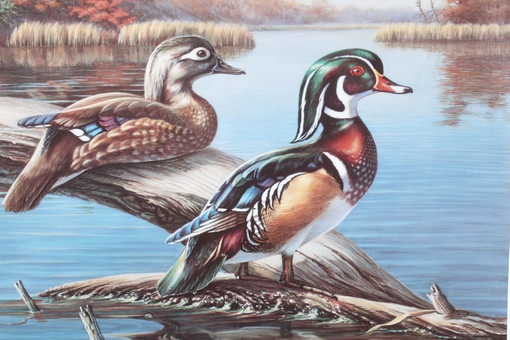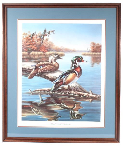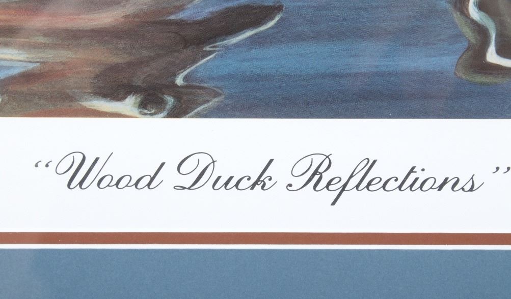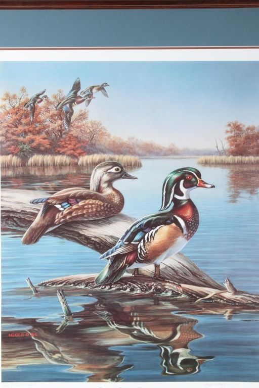 Included in this lot w have a limited edition framed print titled "Wood Duck Reflections" by James Meger and originating from 1984. James Meger was a American wildlife artist known for his oil and acrylic depictions of ducks and other game birds. His are was characterized with excellent life like detail and he often included hidden elements in his paintings becoming known as an artist who paints more than meets the eye. This painting displays a drake and hen wood duck perched on a partially submerged log in a river. The background shows a river with reed covered banks and autumn tree line with three more wood duck flying overhead. The print shows wonderful color and excellent attention to detail. The piece is signed on the painting "Meger 84" as well as hand signed in the bottom right hand corner "James Meger". The print is hand numbered "17/20 Artist's Proof" with the printed "Wood Duck Reflections". The painting is set into a dark stained wood frame with a blue border around the art. The piece shows good condition with little to no wear. The frame measures 28 3/4" wide by 33 3/4" tall with the art measuring 19 1/4" wide by 24" tall.