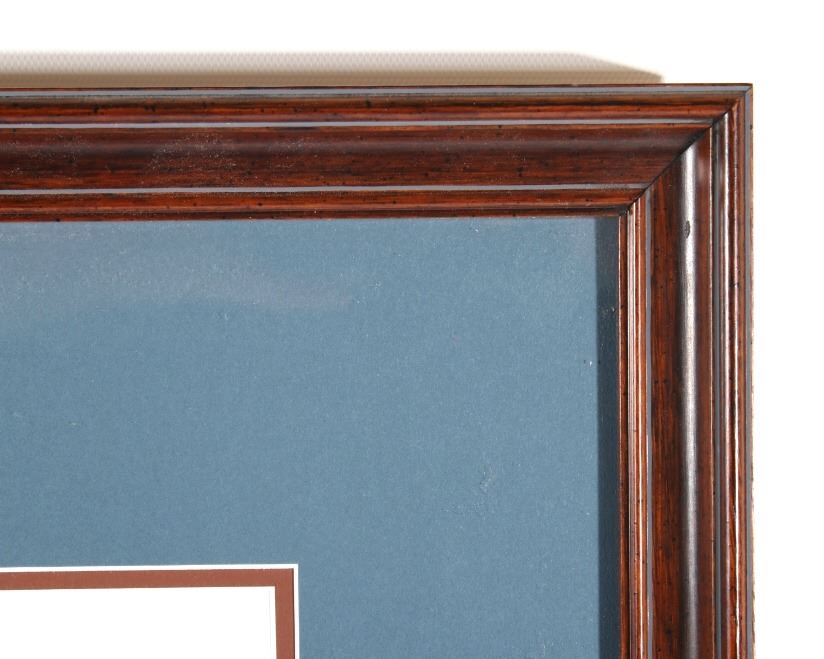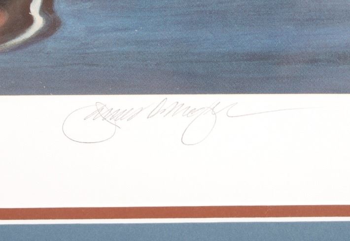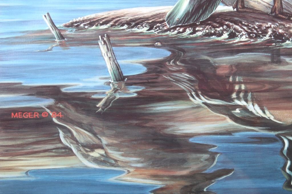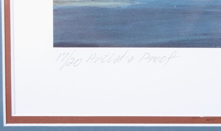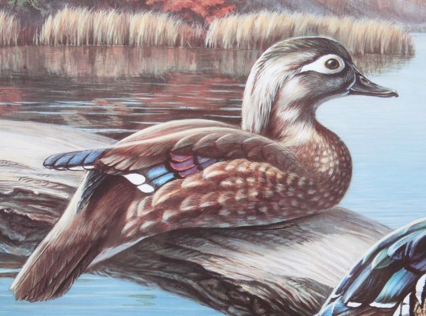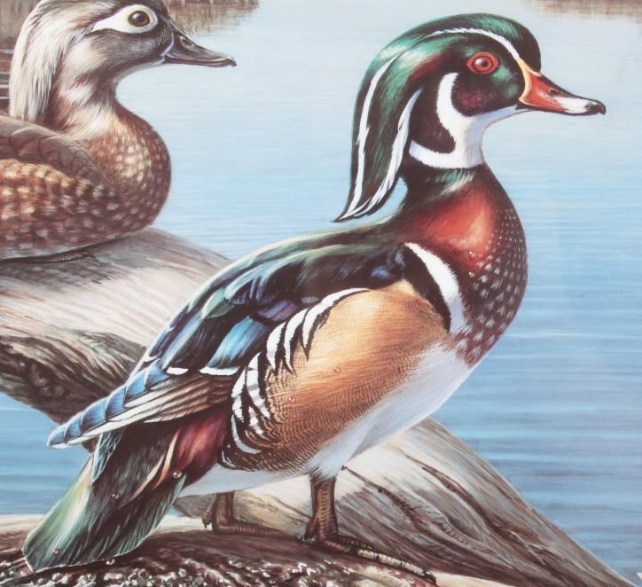 Included in this lot w have a limited edition framed print titled "Wood Duck Reflections" by James Meger and originating from 1984. James Meger was a American wildlife artist known for his oil and acrylic depictions of ducks and other game birds. His are was characterized with excellent life like detail and he often included hidden elements in his paintings becoming known as an artist who paints more than meets the eye. This painting displays a drake and hen wood duck perched on a partially submerged log in a river. The background shows a river with reed covered banks and autumn tree line with three more wood duck flying overhead. The print shows wonderful color and excellent attention to detail. The piece is signed on the painting "Meger 84" as well as hand signed in the bottom right hand corner "James Meger". The print is hand numbered "17/20 Artist's Proof" with the printed "Wood Duck Reflections". The painting is set into a dark stained wood frame with a blue border around the art. The piece shows good condition with little to no wear. The frame measures 28 3/4" wide by 33 3/4" tall with the art measuring 19 1/4" wide by 24" tall.