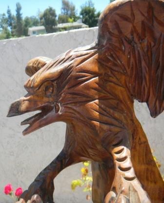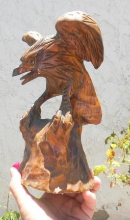 Wood Eagle Carving by Allen Shingle. Made from pine wood, from 1940. Measures 11x7x6 inches. Lower portion of right wing missing. Shipping $15.00