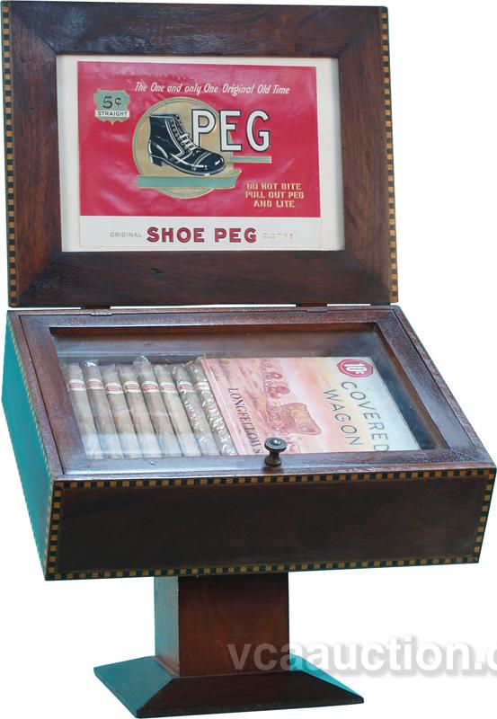 Wood & Glass Store Countertop Cigar Display Case, has "Shoe Peg Cigar" advertisement and a full box of "Covered Wagon Longfellows Cigar", in great condition