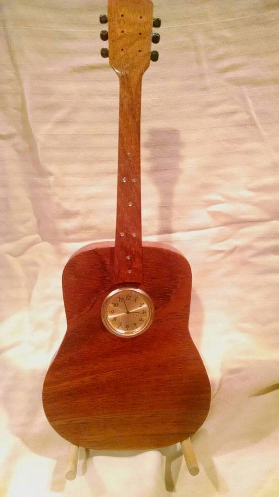 Wood Guitar Clock **|**|** Beautiful wood acoustic guitar clock, with small crystal fret markers on neck. Stands 11" tall by 4" wide by 3/4" deep.