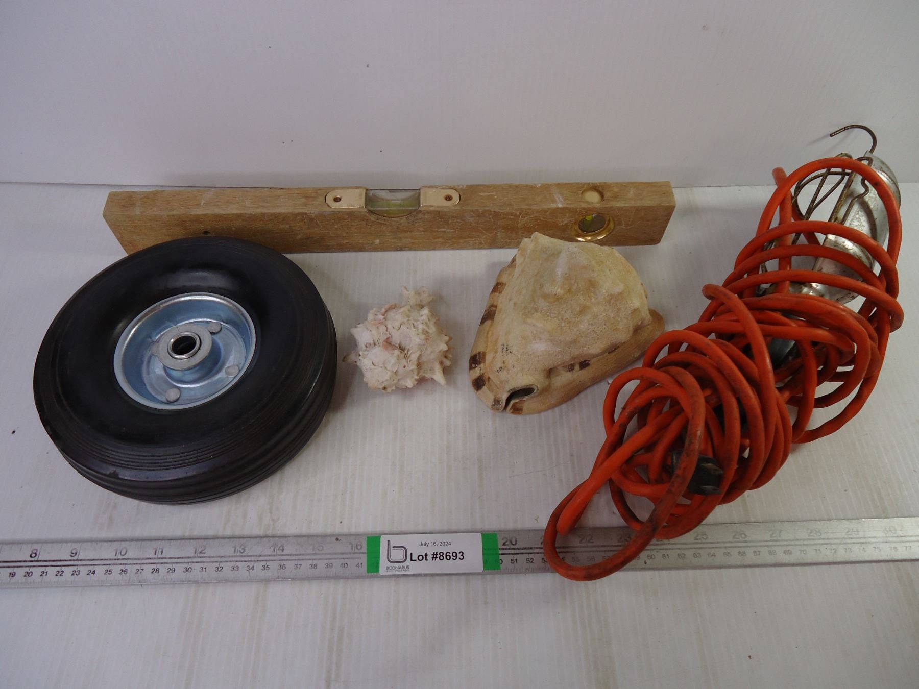 Wood Level, Rubber Tire 8x2.5,Trouble Light0No bulb, untested) and (2) Seashells