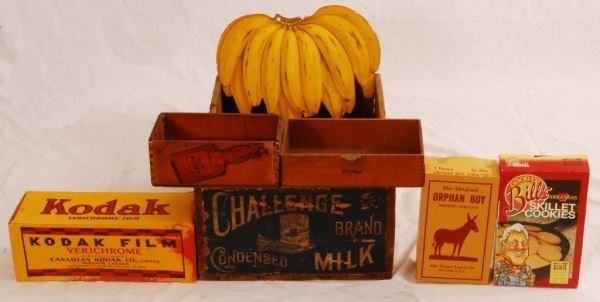 Challenge Brand Condensed Milk wood crate with assorted containers including Kodak, Unifruitco, Orphan Boy Tobacco, and more.