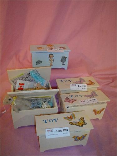 Wooden Mini Toy Boxes (6) - Filled w/Assorted play doll items (kite, teddy bear, umbrella, etc.)