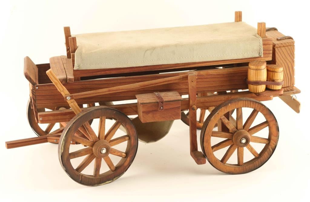'Lincoln Survey' signs on front and back of wagon with canvas covered top, working brake, shovel, barrels and supply boxes on the sides. Good condition, measures 18"l x 9 3/4"h x 9"w
