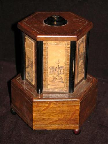 Wood Music Box Cigarette Dispenser, mechanism needs repair, wound too tight. 7.5" tall.